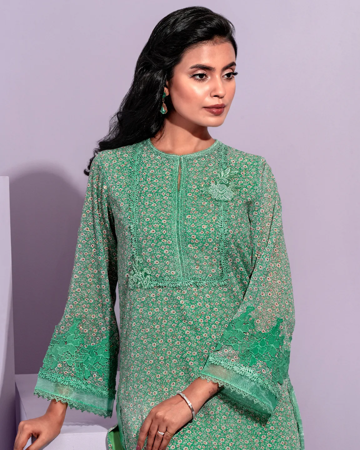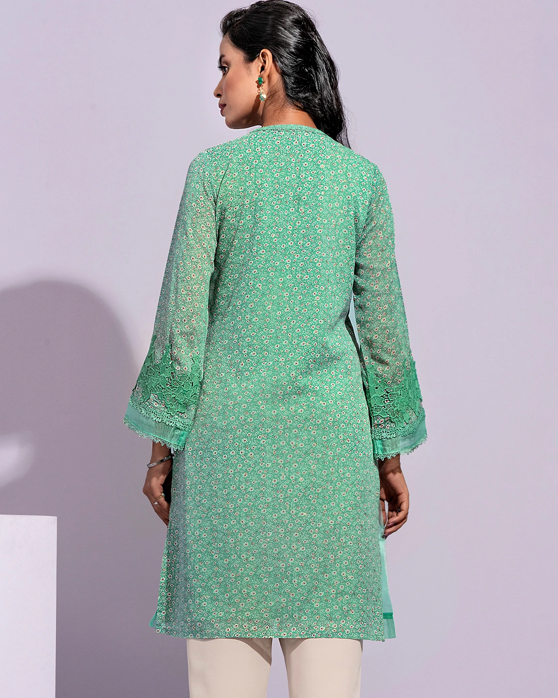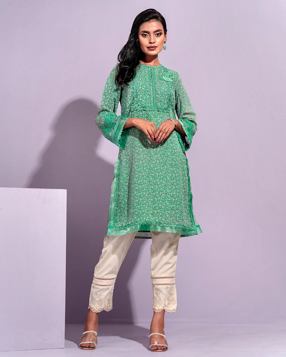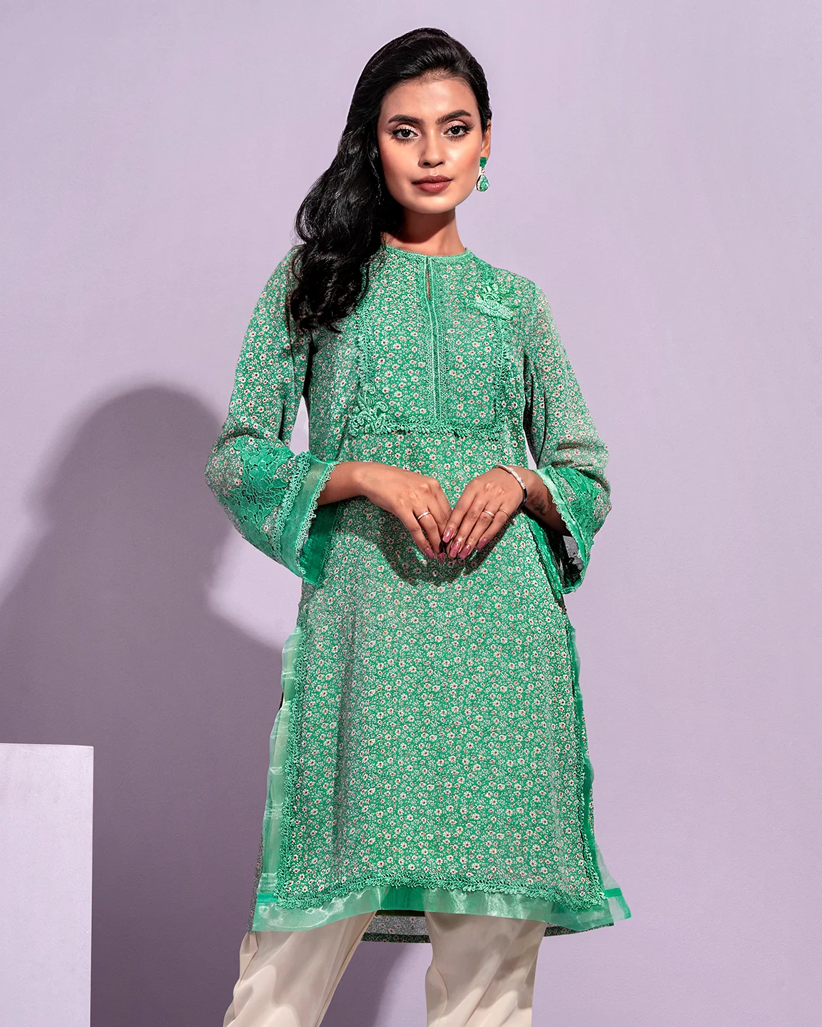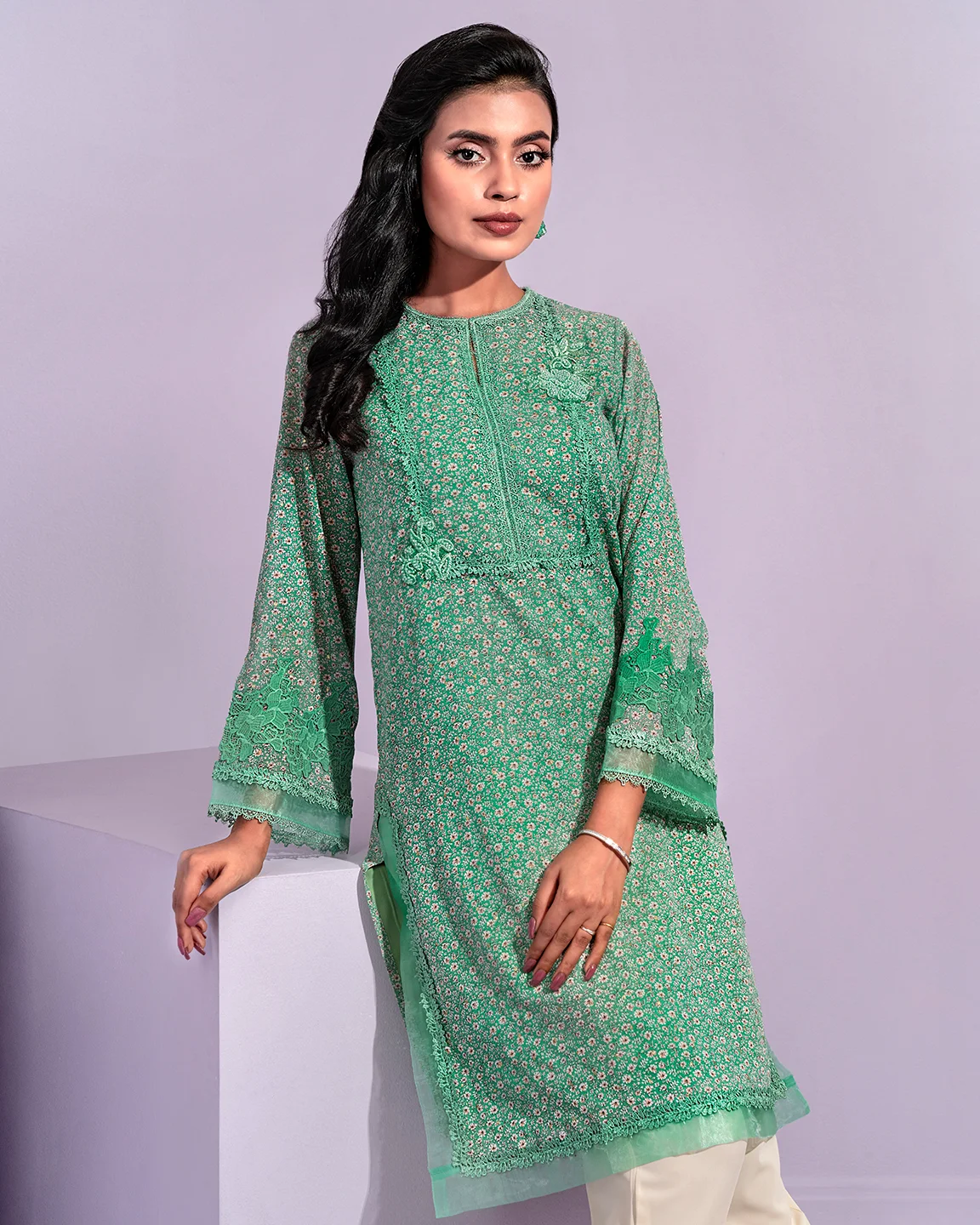 Sold OutFemale Yoke Lace Details & Hand Embroidery Work Short Kamiz | Russian Green