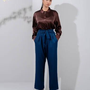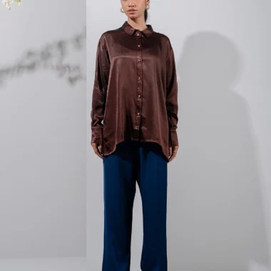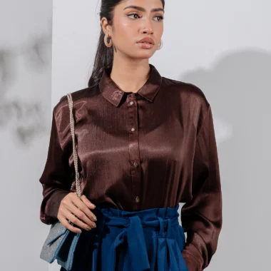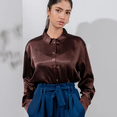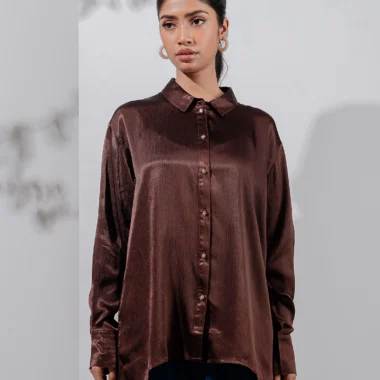 Luxuary Double Silk Casual tops has band collar neck details, has center front placket with button details, has full sleeve details, has shoulder drop details, has straight hemline.