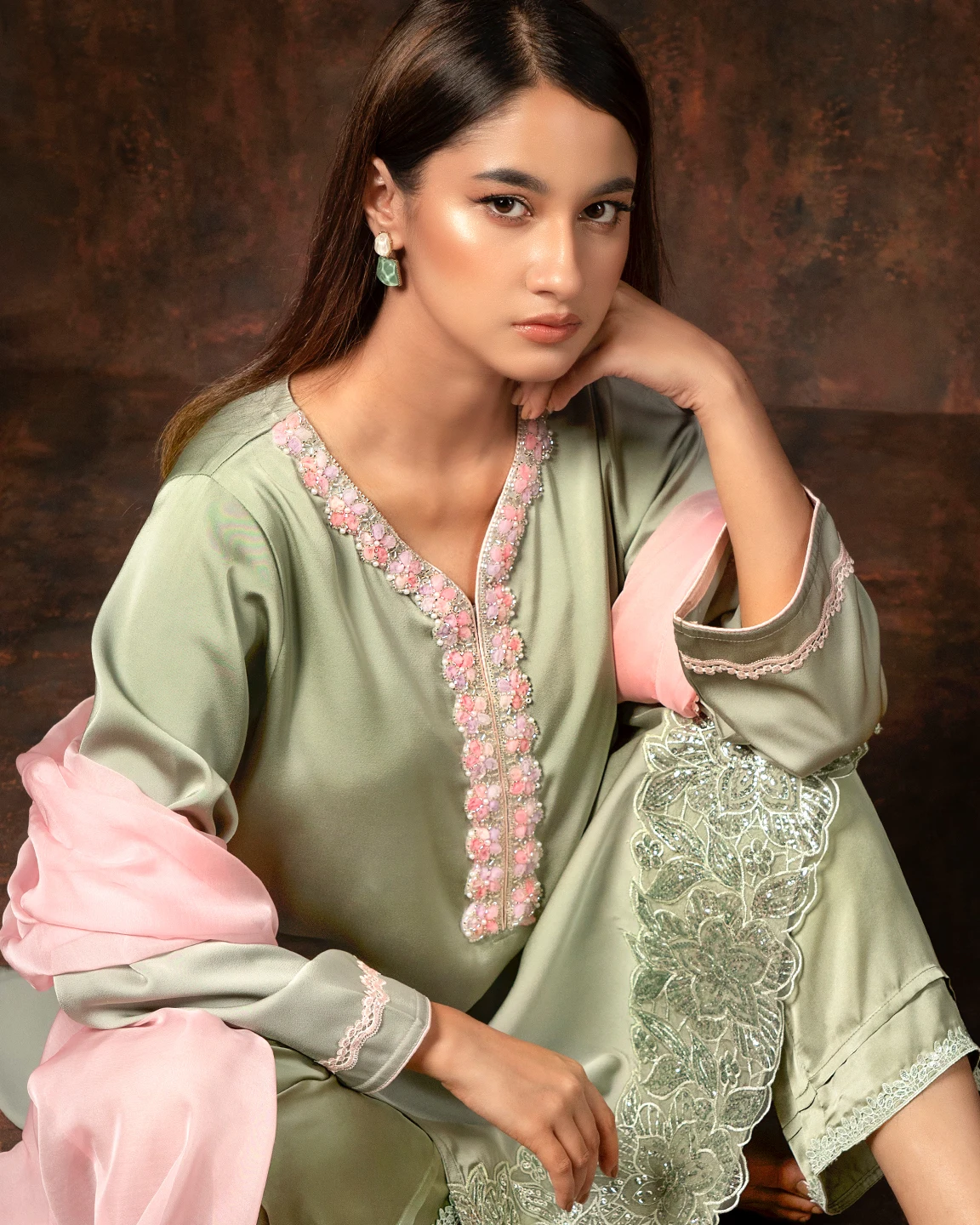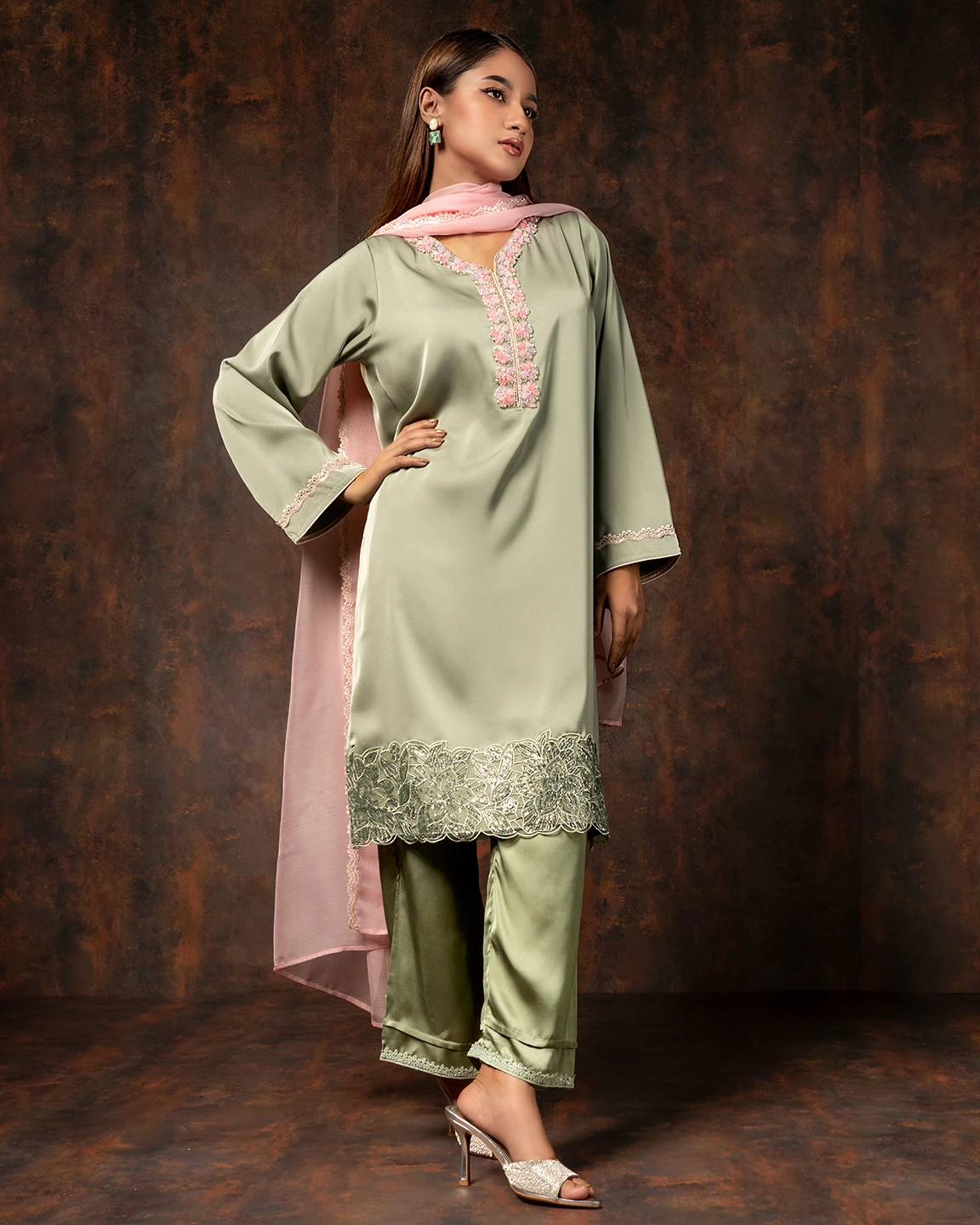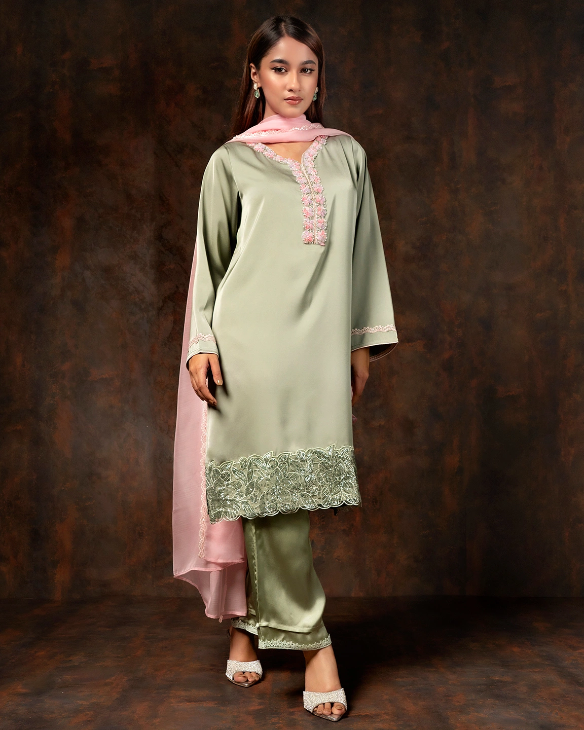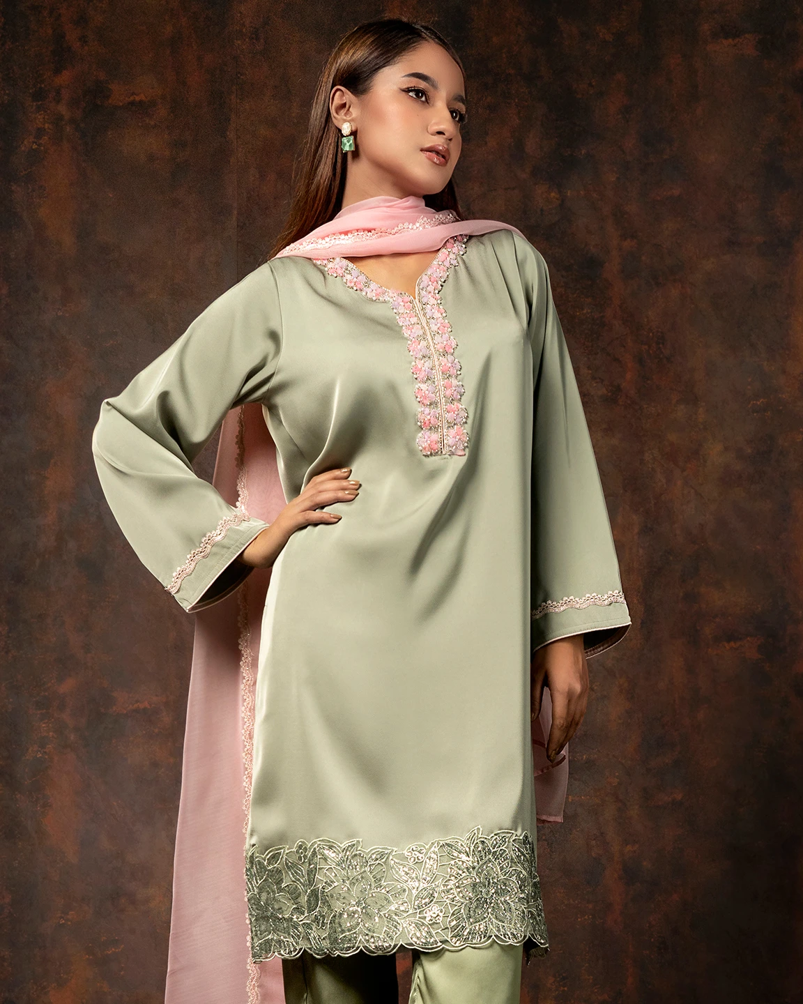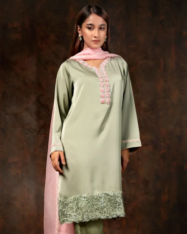 Floral Embroidered Luxury Double Silk Short Kameez | Sage Green