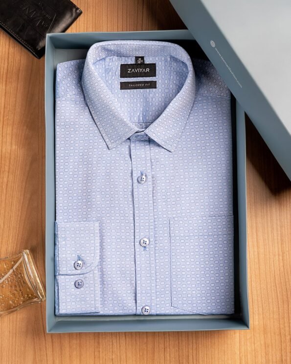 Giza cotton tailored fit woven formal shirt, long sleeve, back yoke straight, front has a pocket, tie collar and collar inside contrast details, front box placket, curved hem.