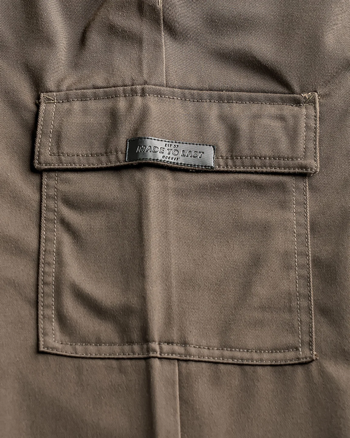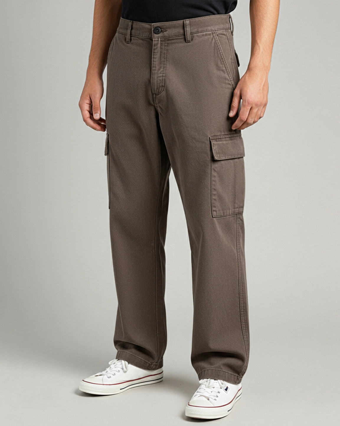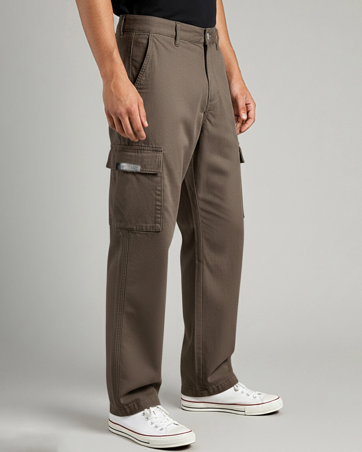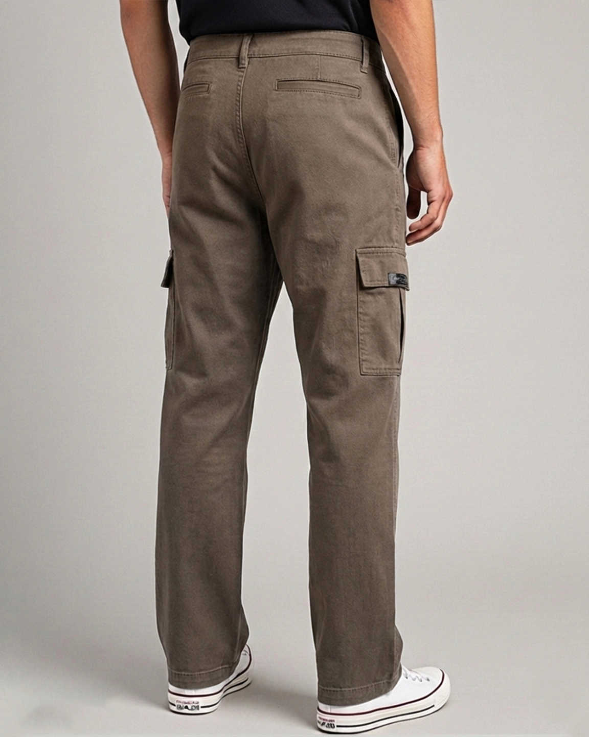 Product Description: Loose-fitted cotton stretch mid-rise cargo pant. This pant features two side pockets, two mid-leg flap pockets with patch logo detailing, and two backbone pockets.