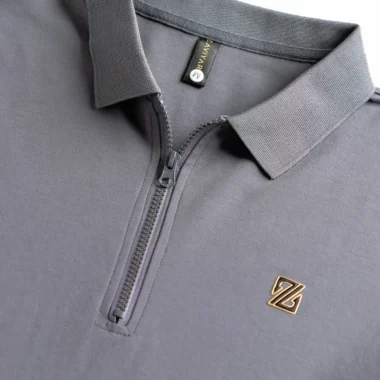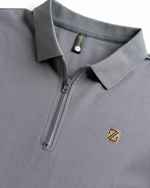 Product Description: Polo shirt by Zaviyar. Structured polo collar with half-zip front closure, half-length sleeves with ribbed cuff, and a branded chest logo detailing. Crafted with airtech double-sided fabric.
