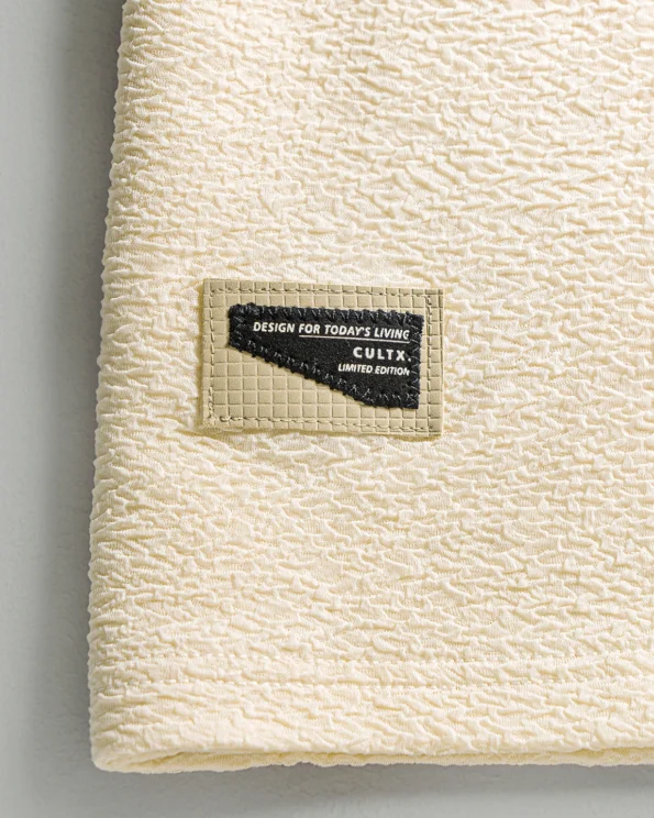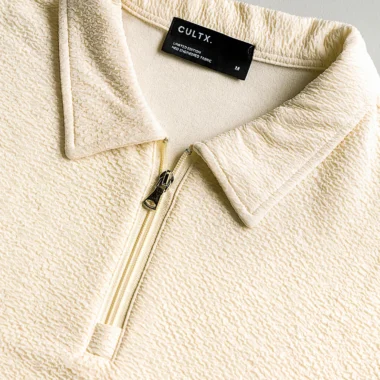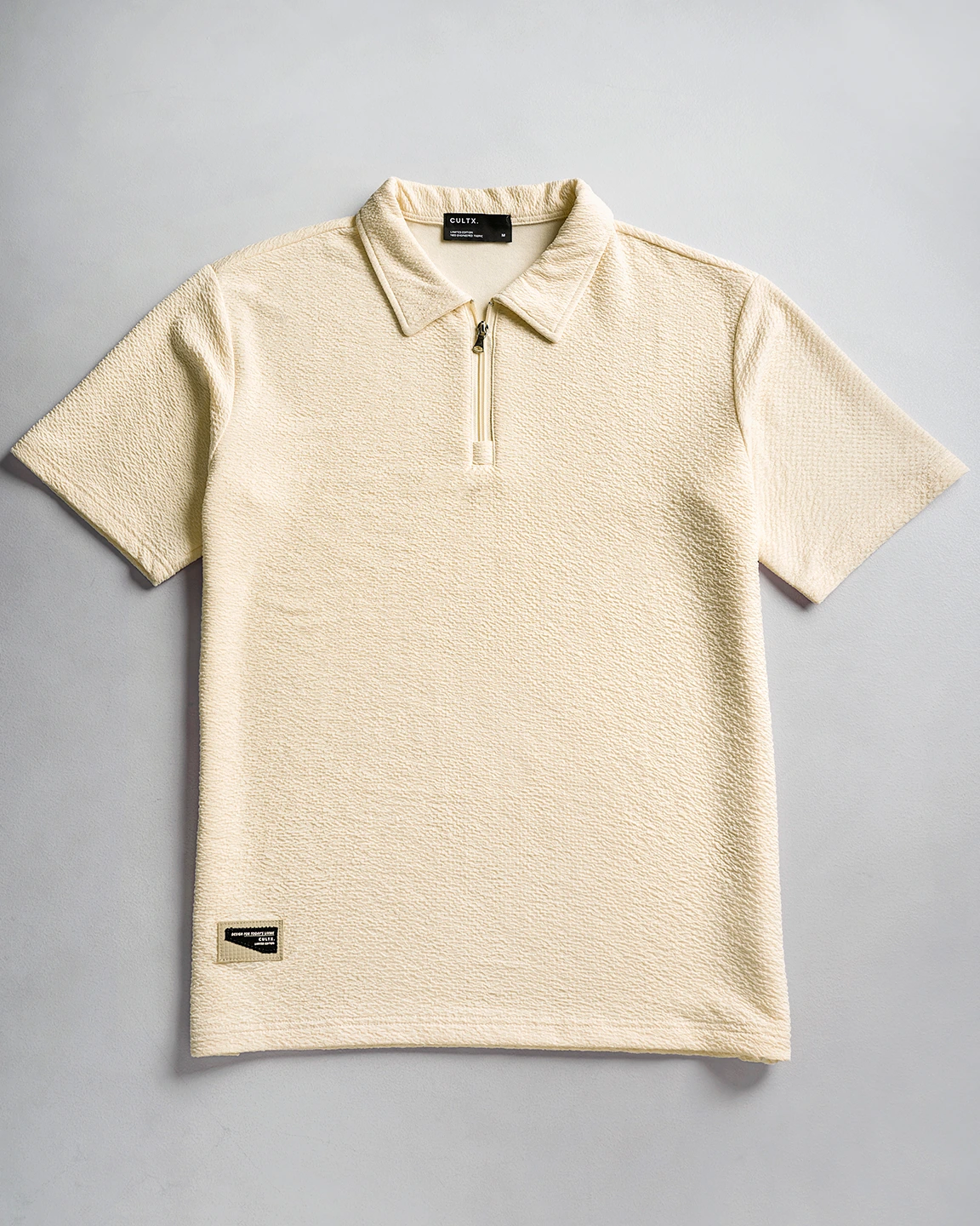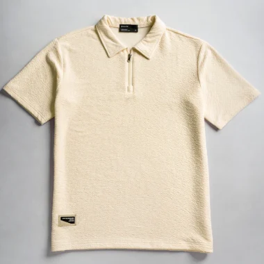 Product Description: Textured polo shirt. Structured polo collar with half-zip front closure, half-length sleeves and a front side branded patch logo detailing. Crafted with luxury cotton mix fabric.