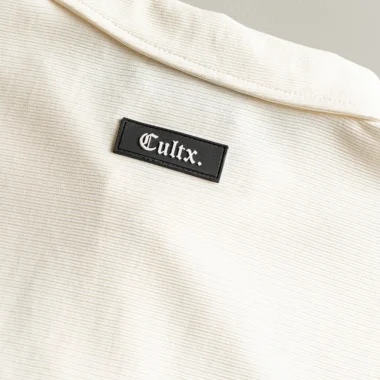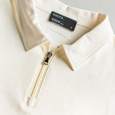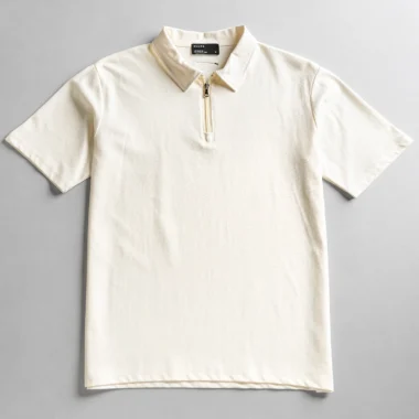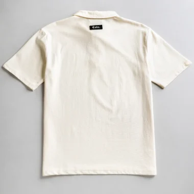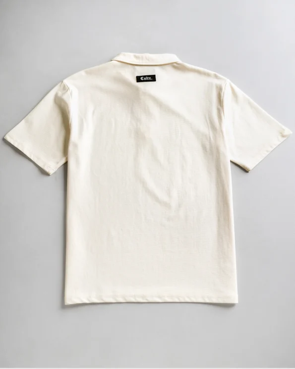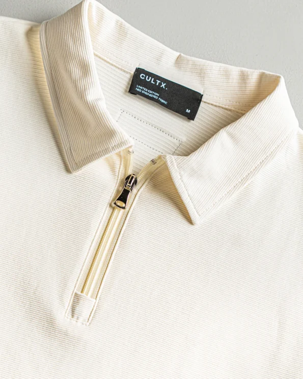 Product Description: Textured polo shirt. Structured polo collar with half-zip front closure, half-length sleeves, and a branded logo detailing below the collar on the backside. Crafted with luxury cotton mix fabric.