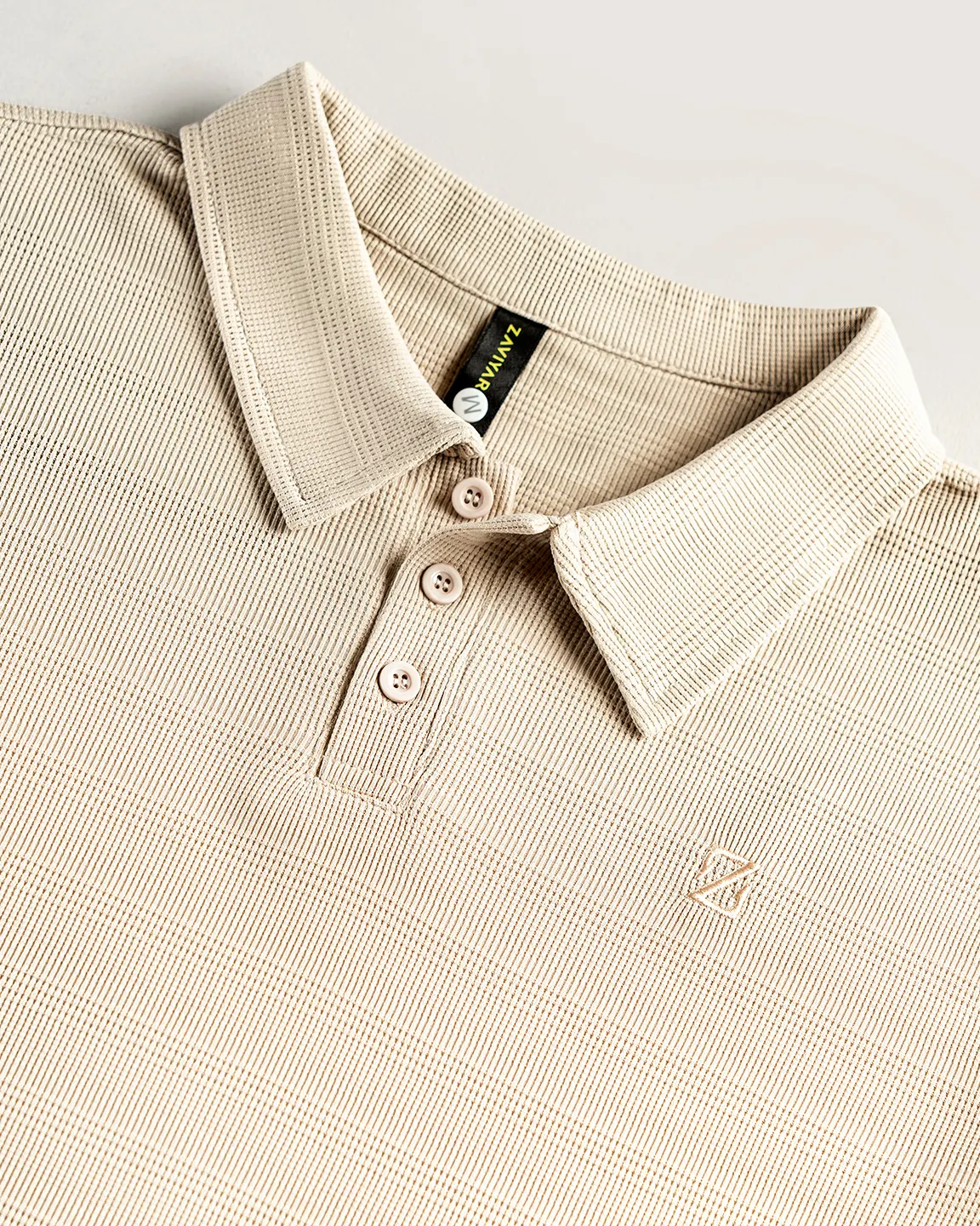 Product Description: Polo shirt by Zaviyar. Structured polo collar with a 3-button placket, half-length sleeves, and chest embroidery logo detailing. Crafted with rayon fabric.