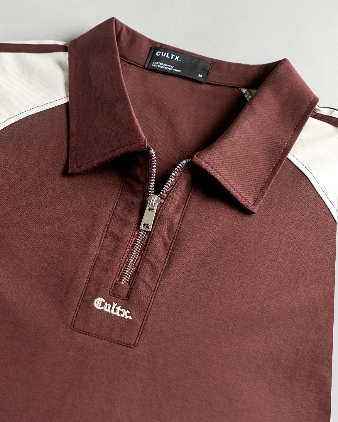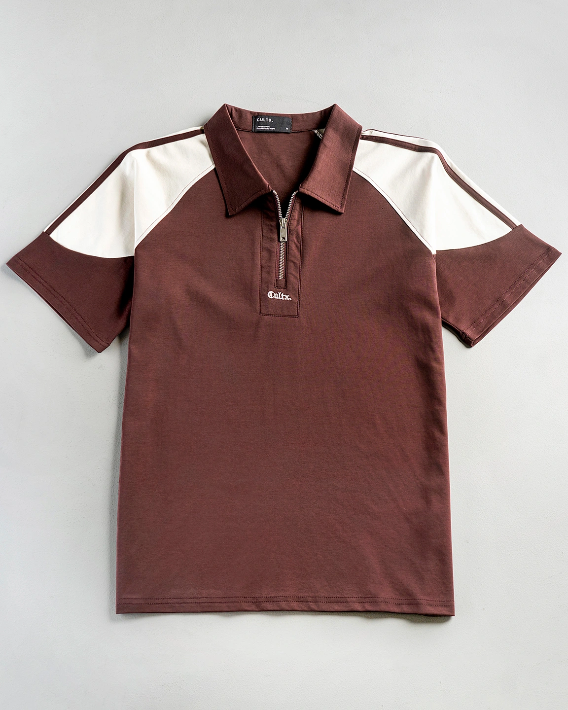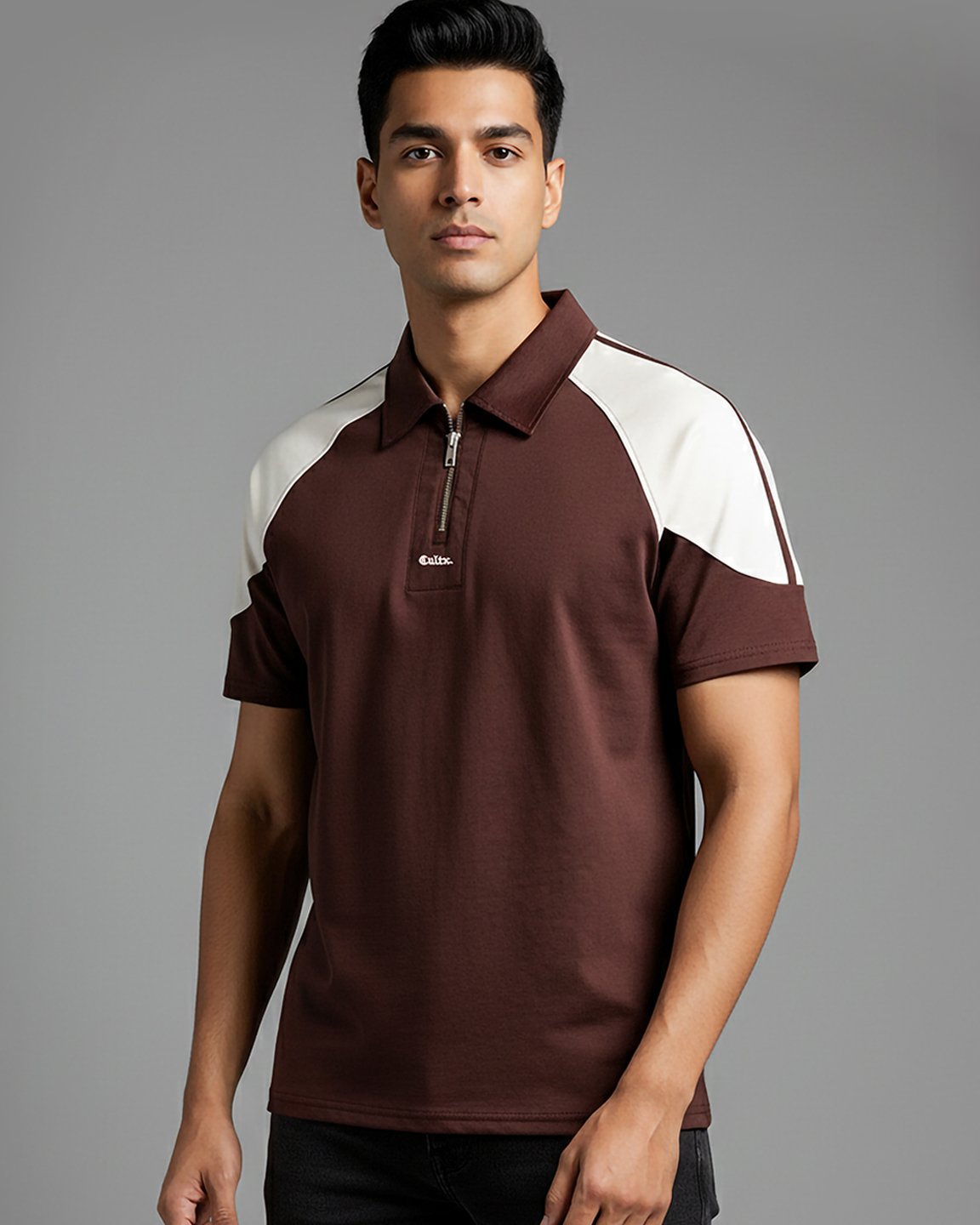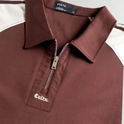 Product Description: Polo shirt by Occult. Structured polo collar with half-zip front closure, half-length sleeves, and a branded embroidery logo detailing above the zipper placket.  Crafted with cotton mix fabric.