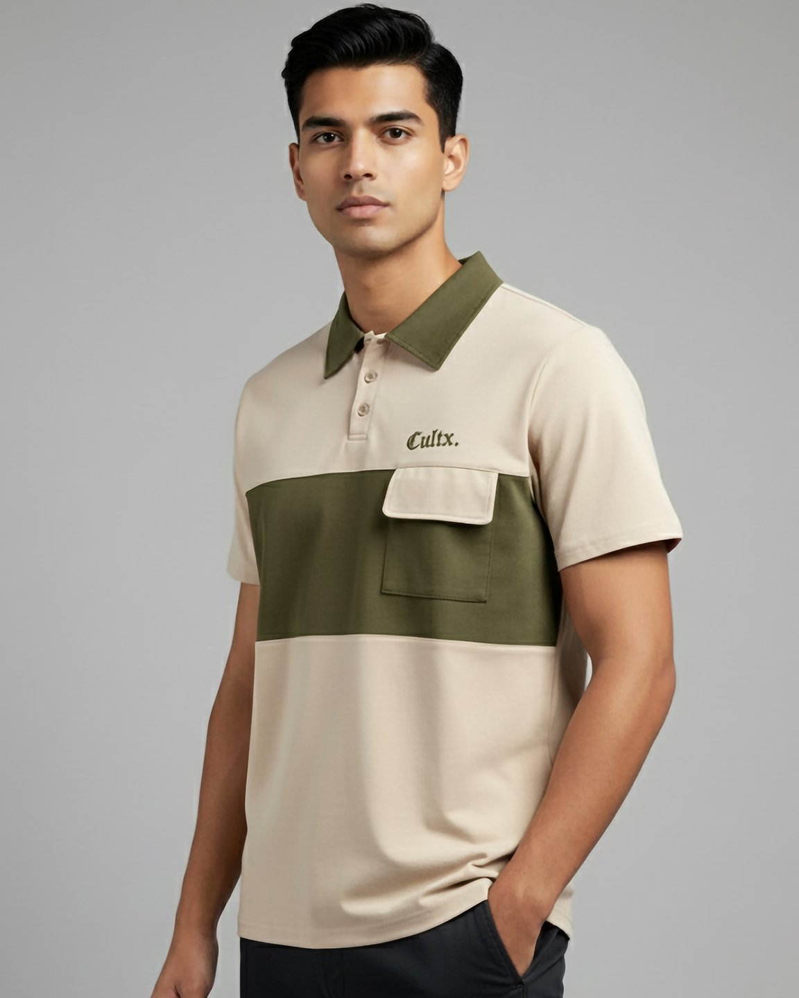 Product Description: Polo shirt by Occult. Structured polo collar with a 3-button placket, half-length sleeves, a functional patch pocket with a flap on the chest, and a branded embroidery logo detailing. Crafted with cotton mix fabric.
