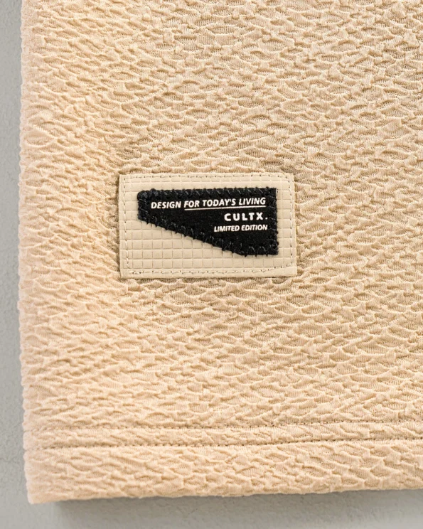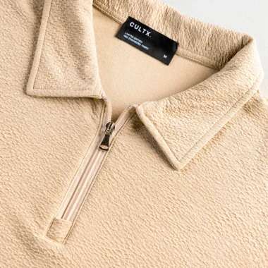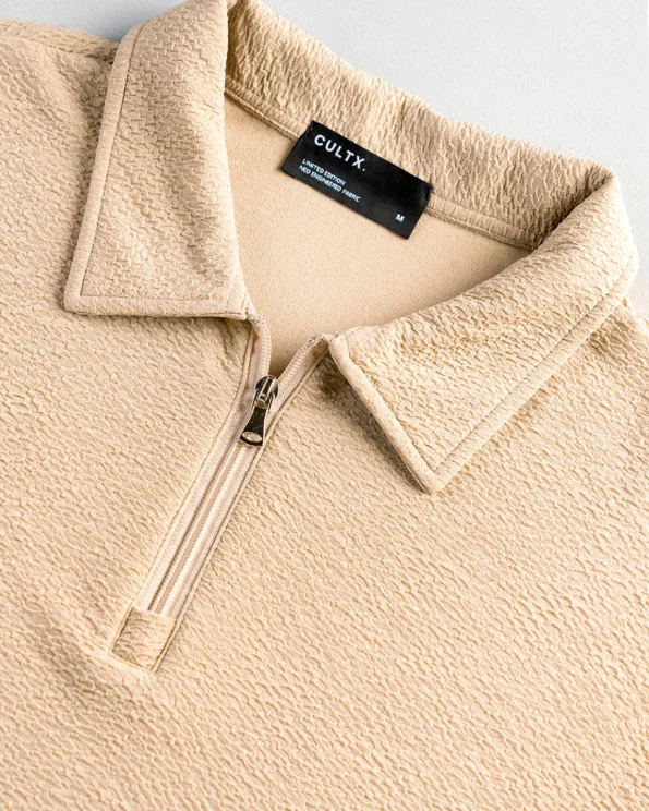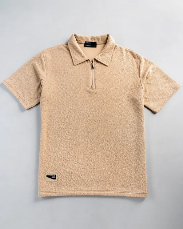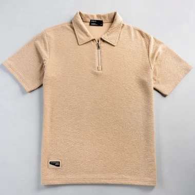 Product Description: Textured polo shirt. Structured polo collar with half-zip front closure, half-length sleeves and a front side branded patch logo detailing. Crafted with luxury cotton mix fabric.