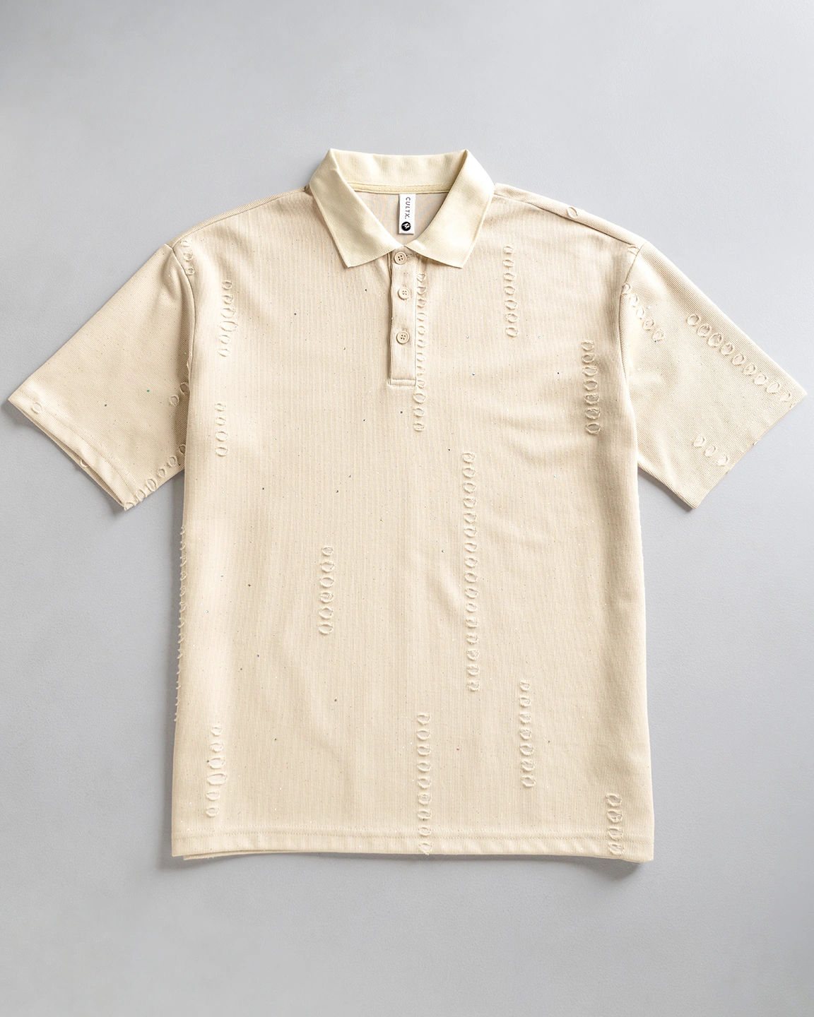 Product Description: Textured polo shirt. Structured polo collar with a 3-button placket, half-length sleeves, and a branded side label detailing. Crafted with airtech double-sided fabric.