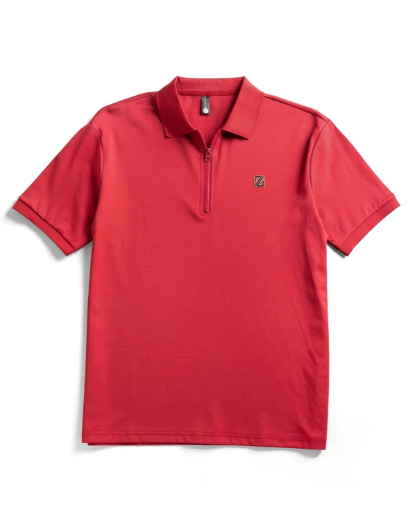 Product Description: Polo shirt by Zaviyar. Structured polo collar with half-zip front closure, half-length sleeves with ribbed cuff, and a branded chest logo detailing. Crafted with airtech double-sided fabric.