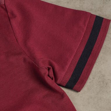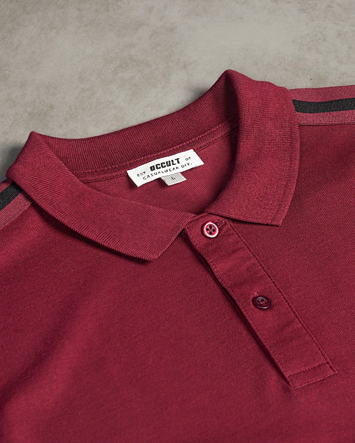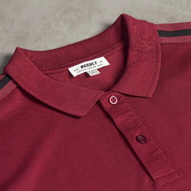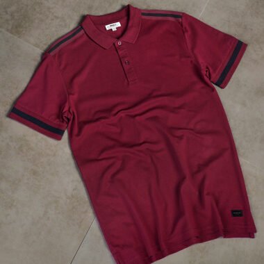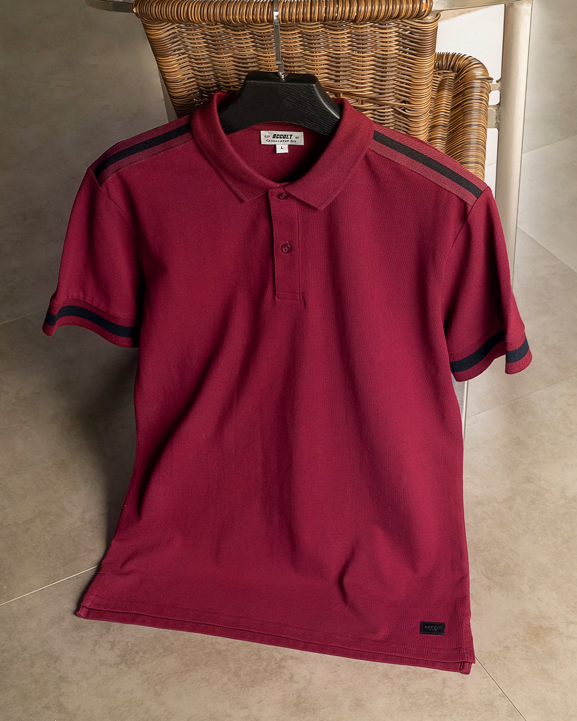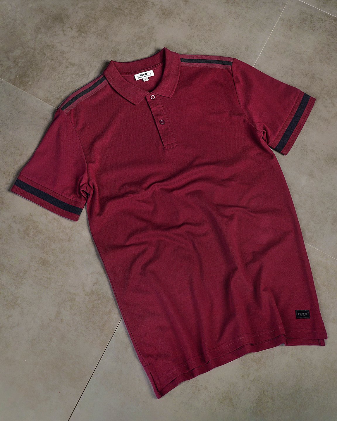 Product Description: Knit Polo. Short sleeve rib cuff, Shoulder line has a decorative twill tape design and button placket on rib. On bottom has a patch details, straight hem, DTM Button.