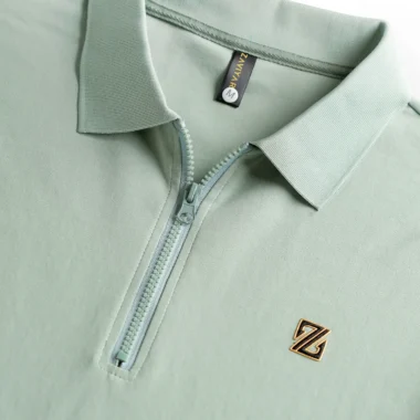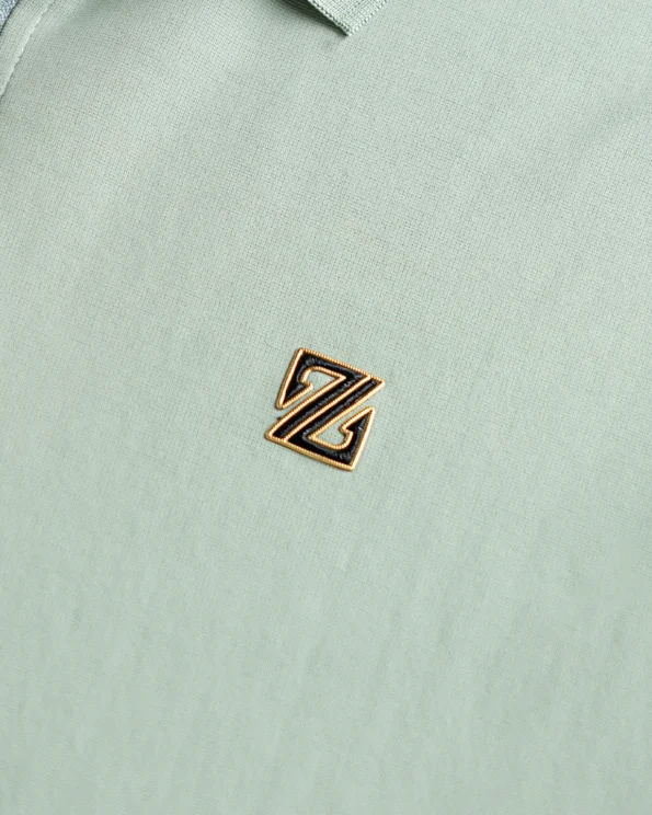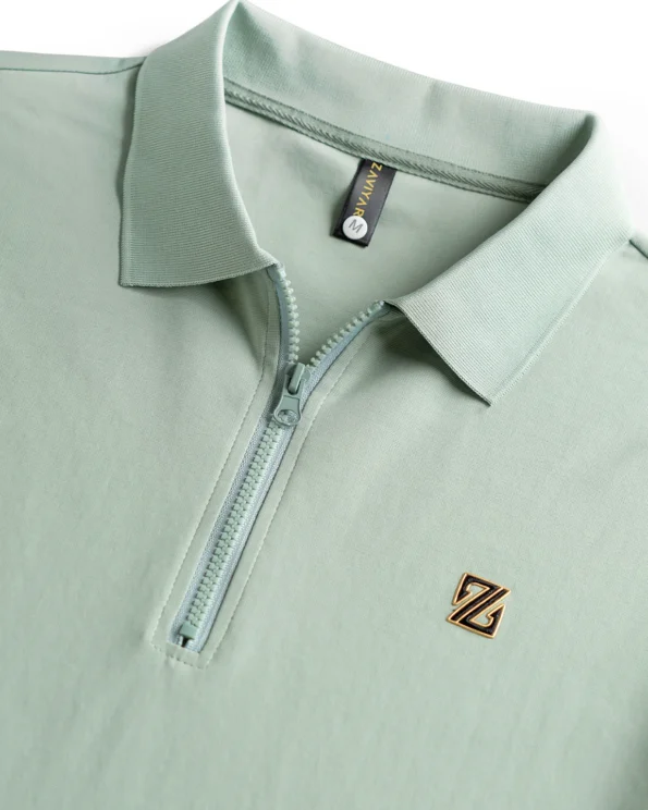 Product Description: Polo shirt by Zaviyar. Structured polo collar with half-zip front closure, half-length sleeves with ribbed cuff, and a branded chest logo detailing. Crafted with airtech double-sided fabric.