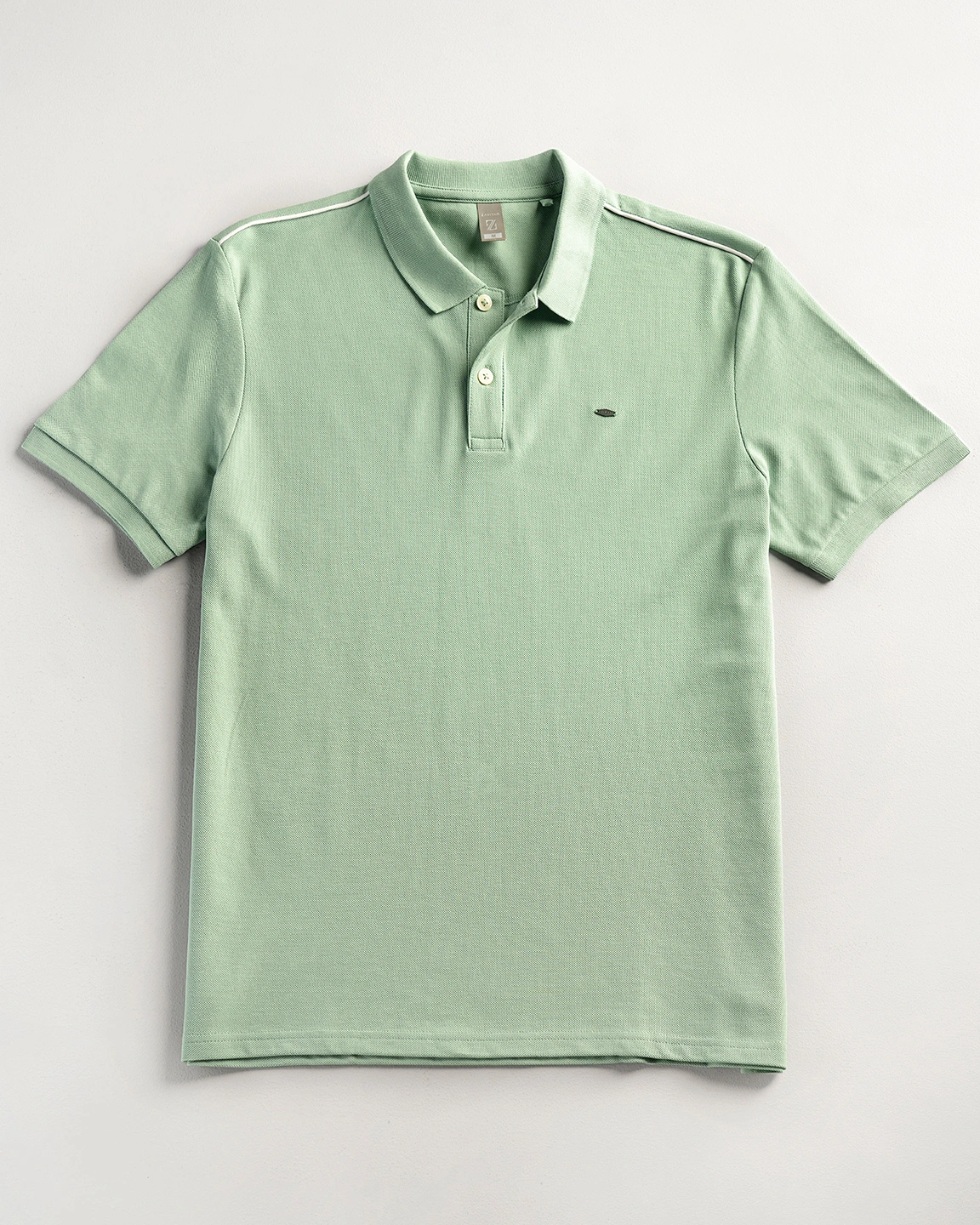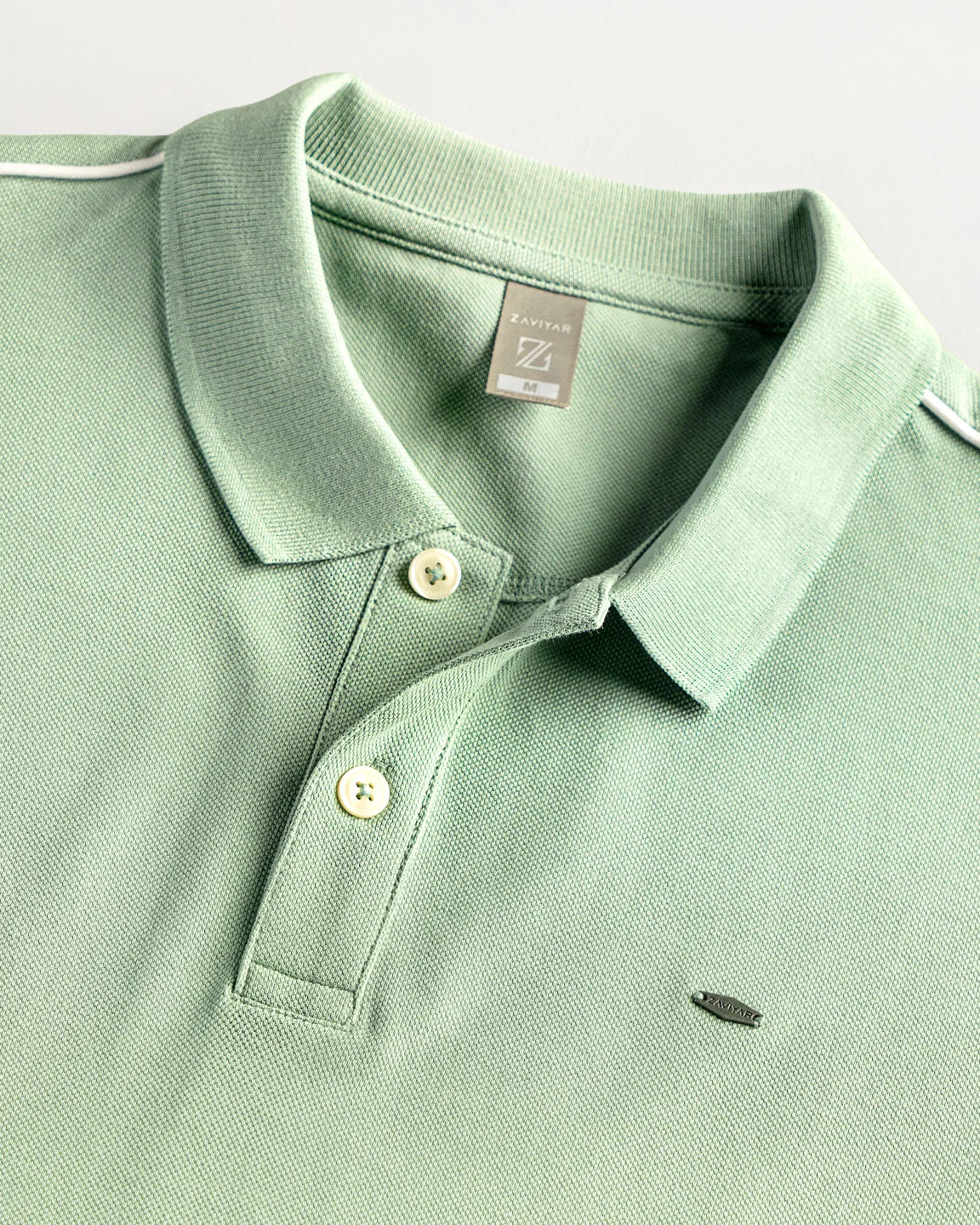 Product Description: Polo shirt by Zaviyar. Flat-knit collar with two-button placket, half-length sleeves with ribbed cuff, contrasted white shoulder stripe, and a subtle branded metal logo on the chest.