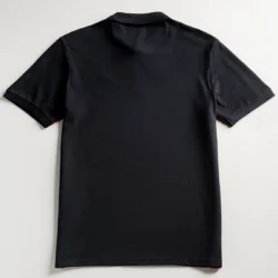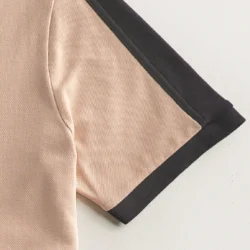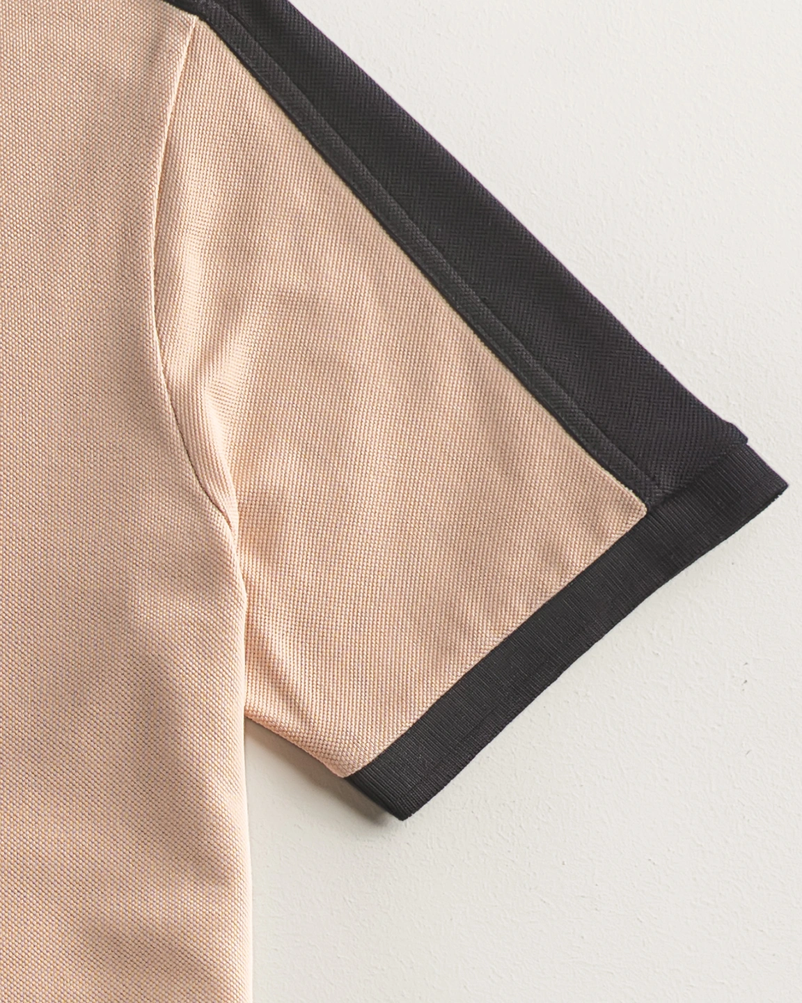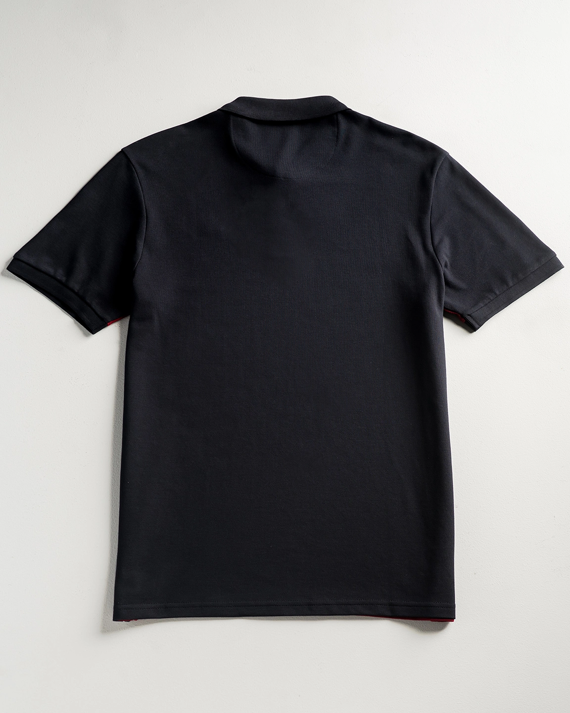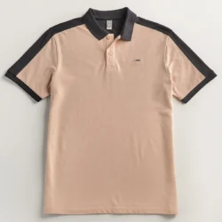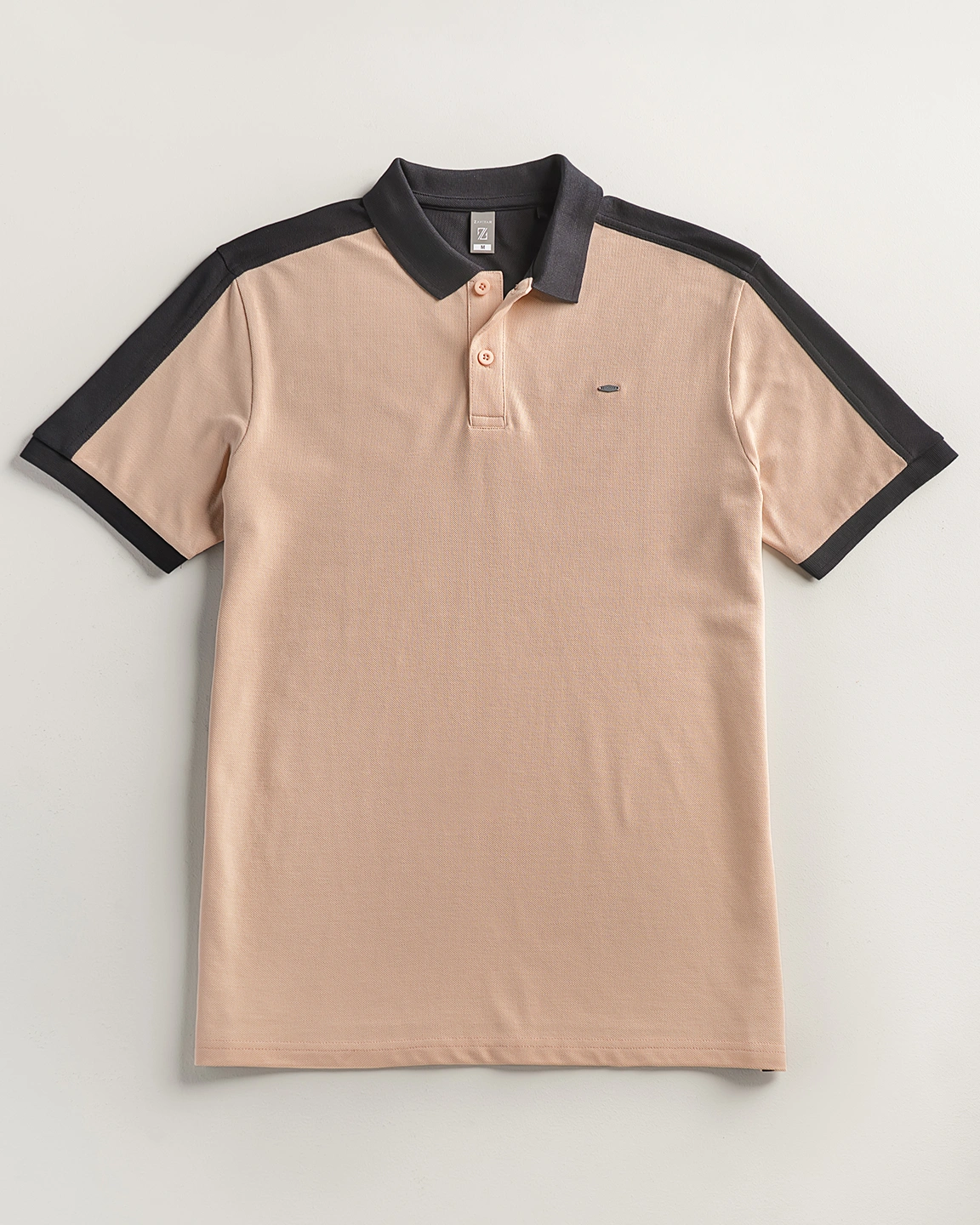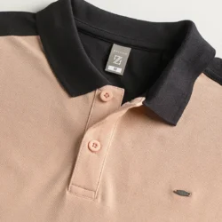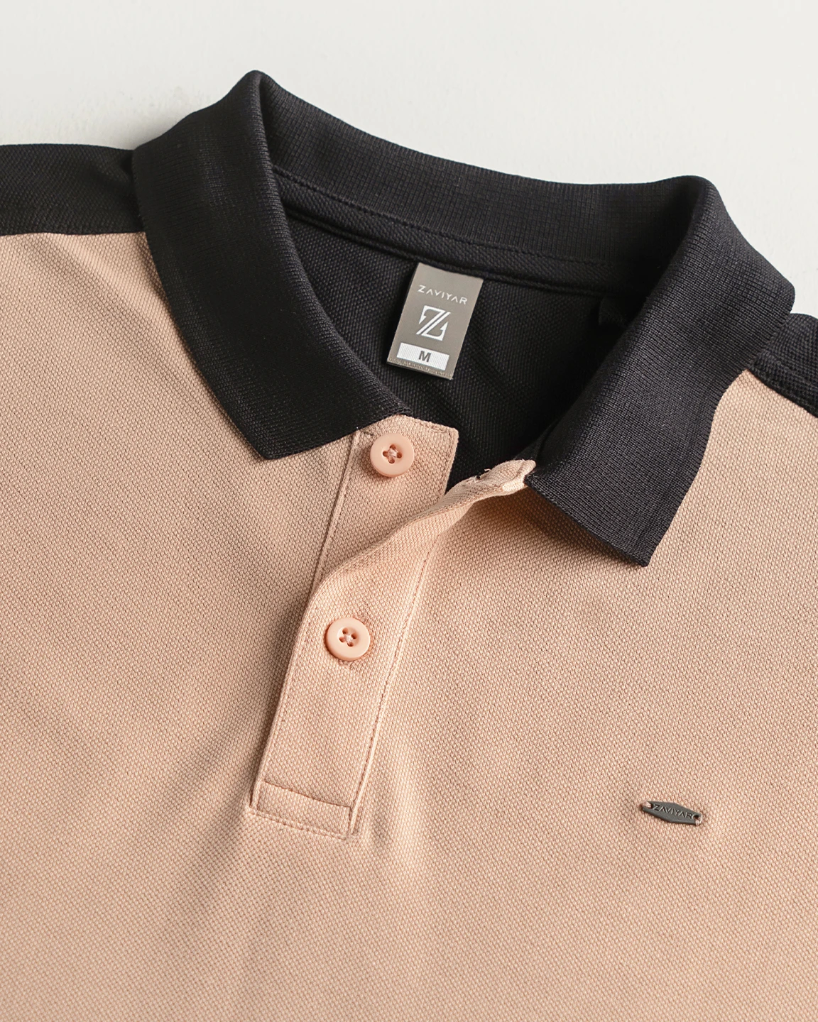 Product Description: Polo shirt by Zaviyar. Flat-knit collar with two-button placket, half-length sleeves with ribbed cuff, contrasted two-tone color, and a subtle branded metal logo on the chest.
