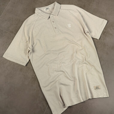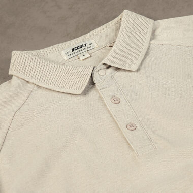 Product Description: Knit Polo. Short raglan sleeve rib cuff. Top button DTM snap button and rest are DTM plastic. chest embroidery details, half moon back yoke, straight hem.