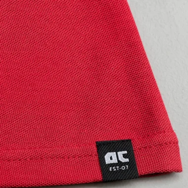 Product Description : Knit Polo. Short sleeve rib cuff, Shoulder line has a decorative twill tape design and button placket on rib. On chest has a patch details, half moon back yoke, straight hem, DTM Button.