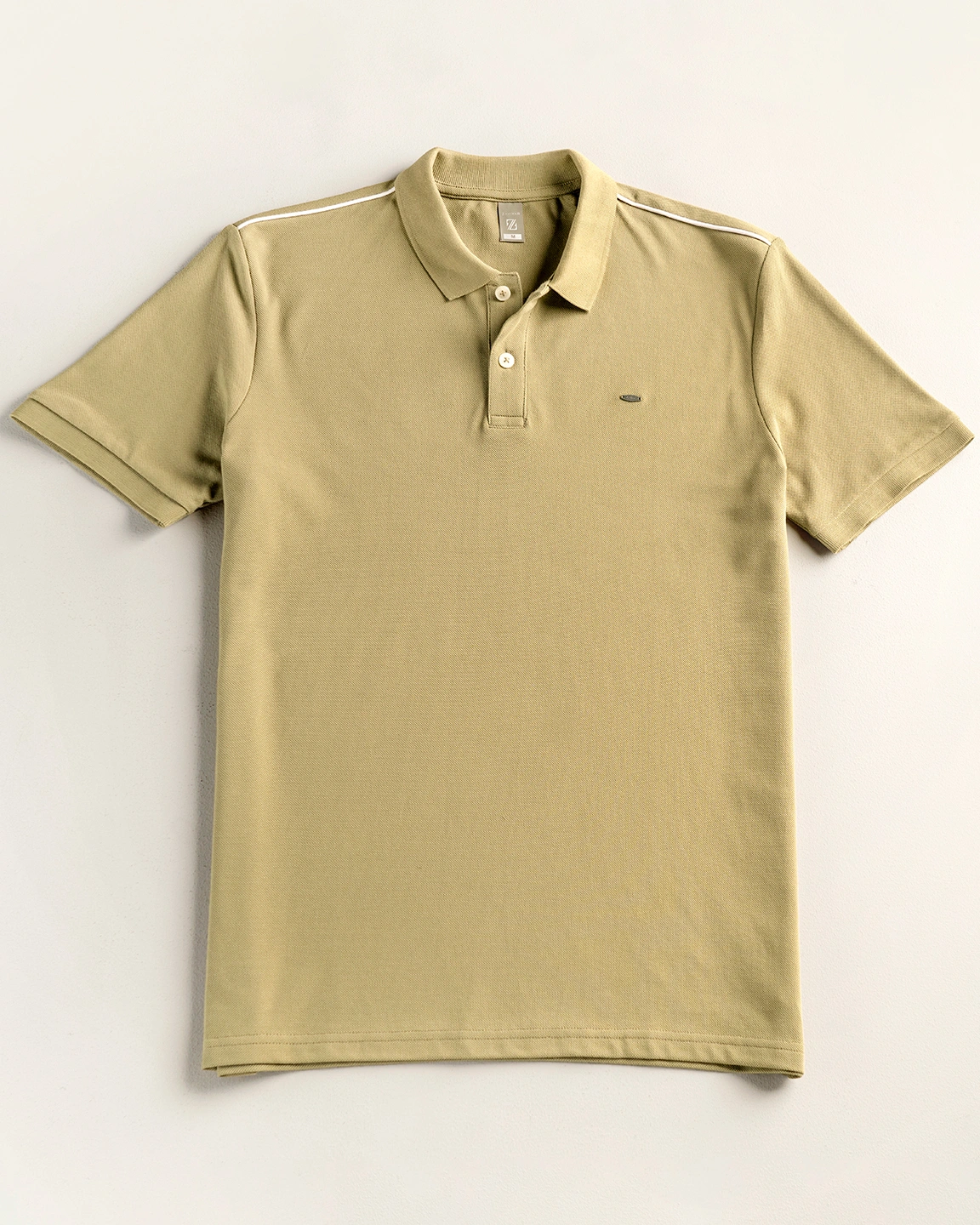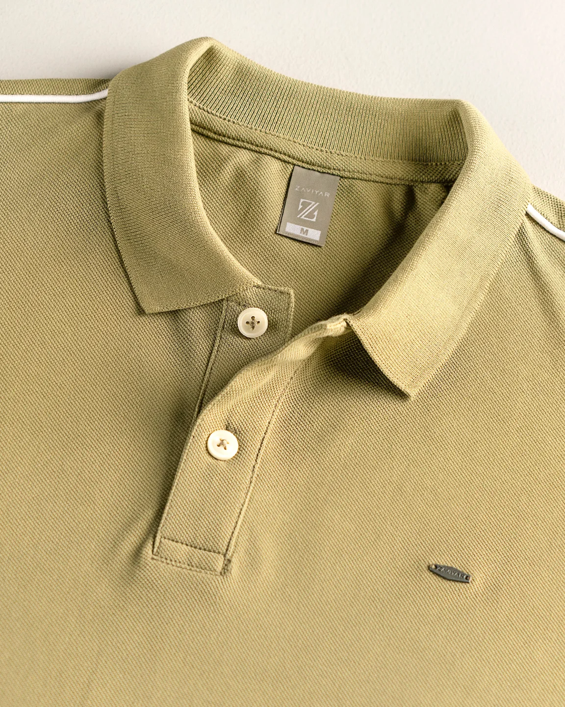 Product Description: Polo shirt by Zaviyar. Flat-knit collar with two-button placket, half-length sleeves with ribbed cuff, contrasted white shoulder stripe, and a subtle branded metal logo on the chest.