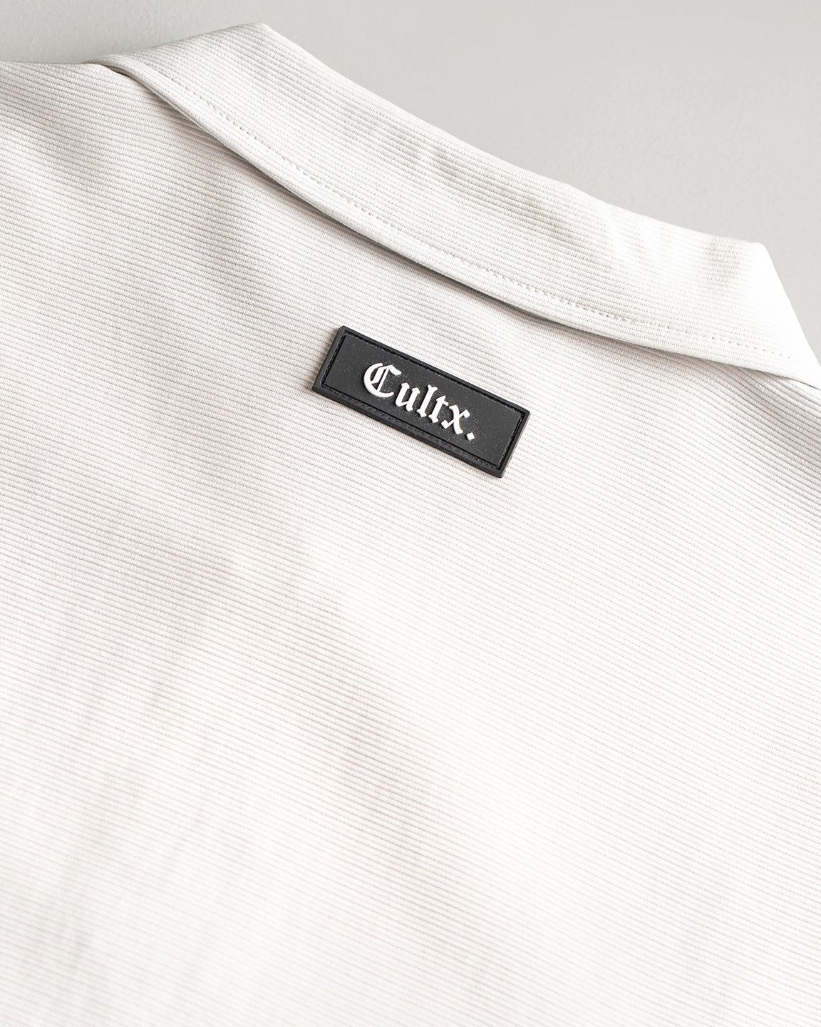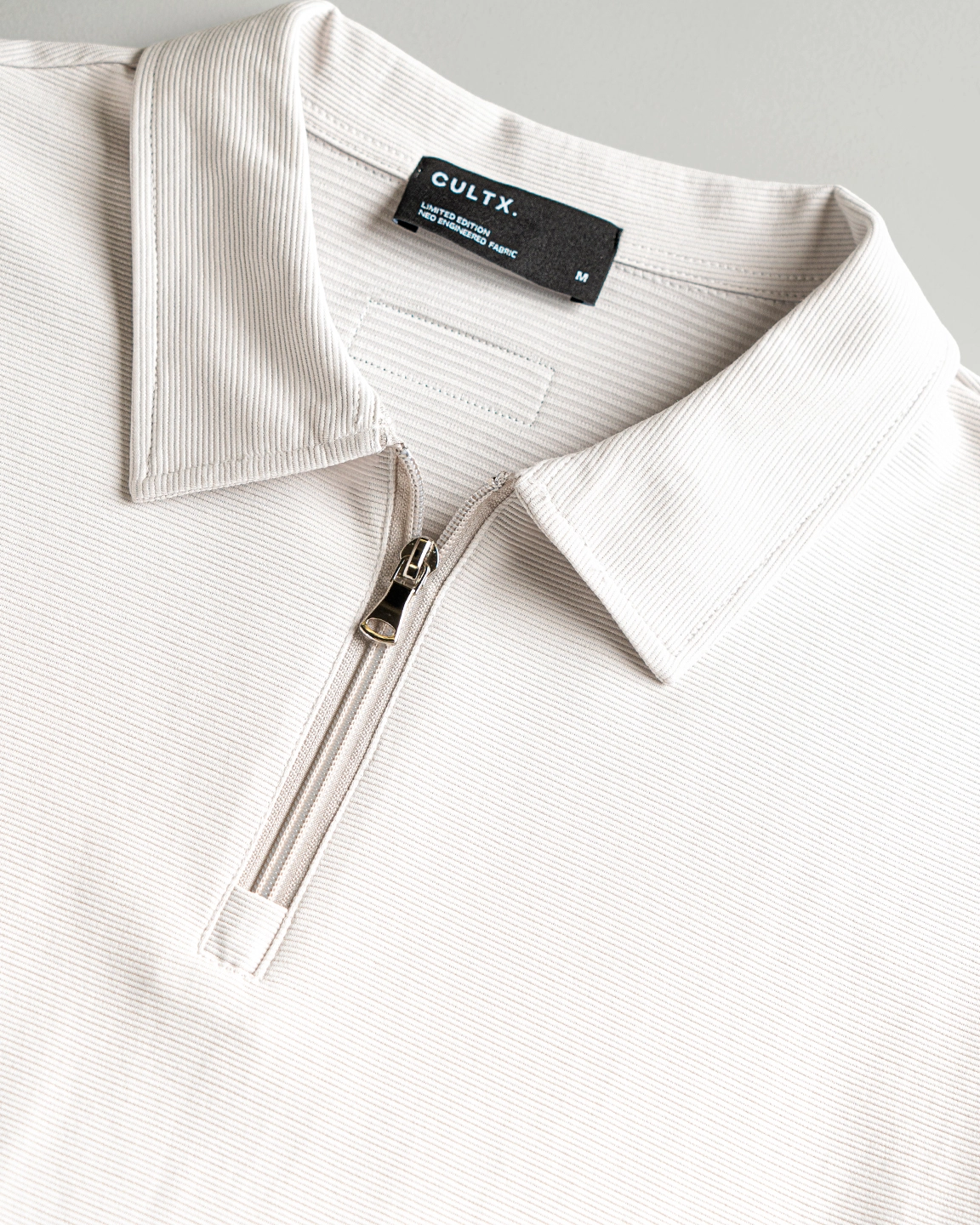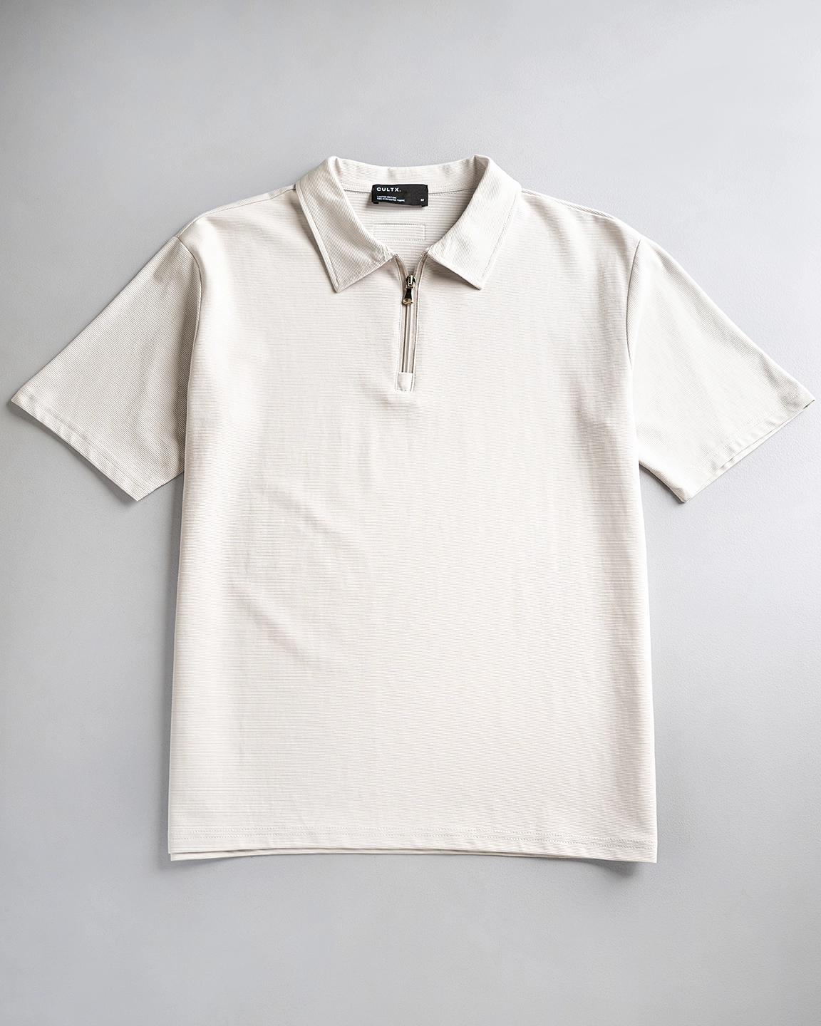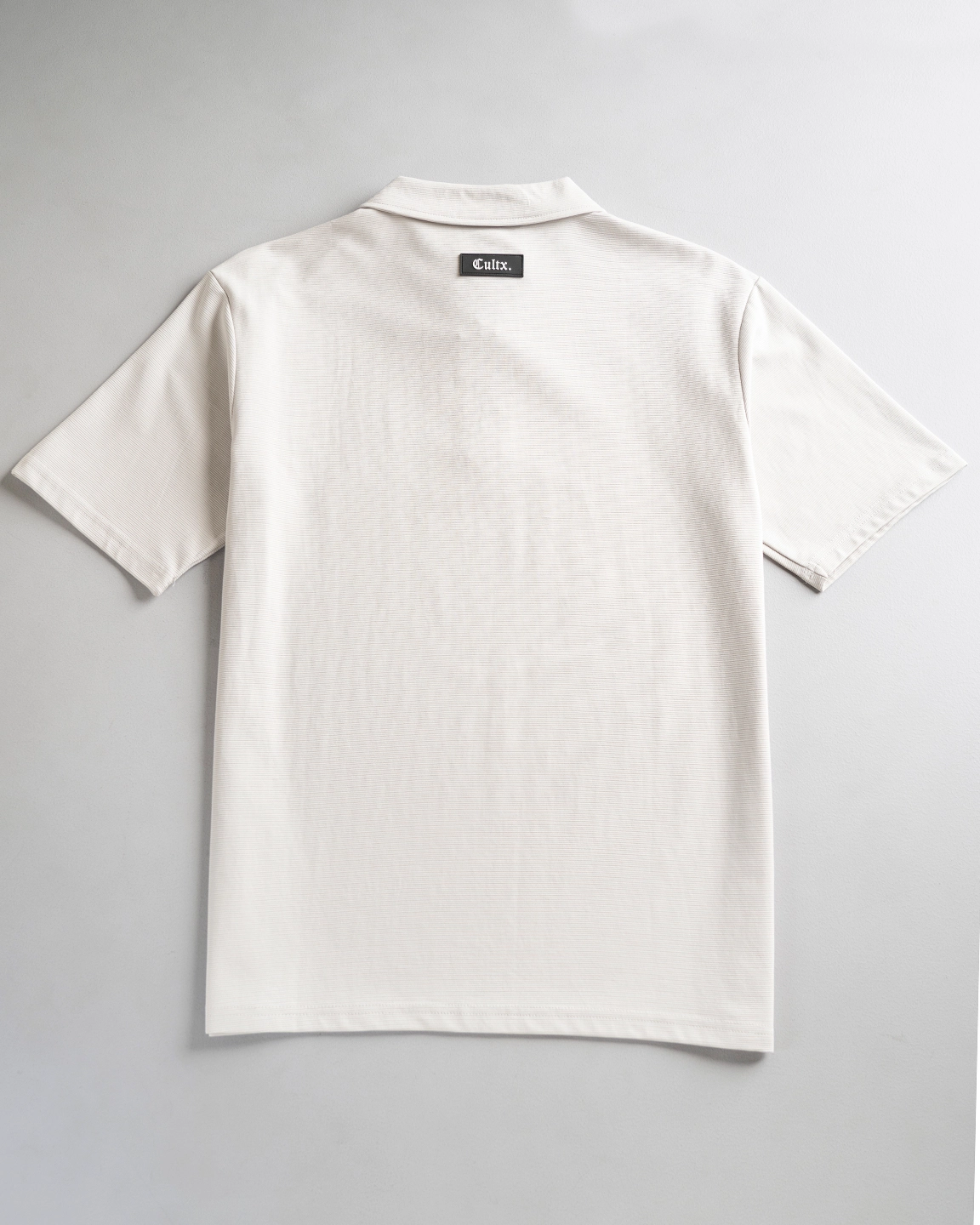 Product Description: Textured polo shirt. Structured polo collar with half-zip front closure, half-length sleeves, and a branded logo detailing below the collar on the backside. Crafted with luxury cotton mix fabric.