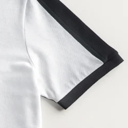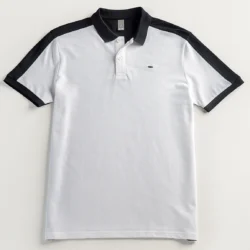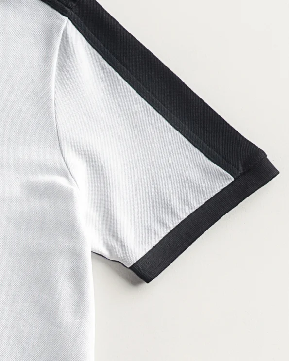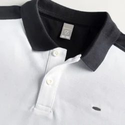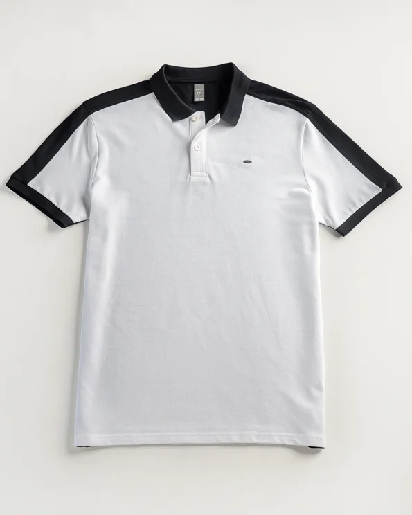 Product Description: Polo shirt by Zaviyar. Flat-knit collar with two-button placket, half-length sleeves with ribbed cuff, contrasted two-tone color, and a subtle branded metal logo on the chest.