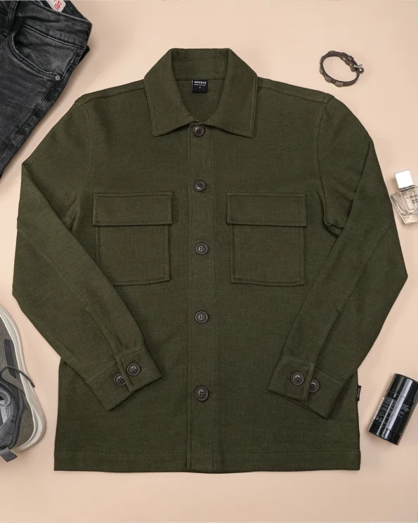 Product Description: Knit Shacket. Jacket & shirt combination . Full sleeve wide collar with cuff and button placket with large size button. Bottom hem is slightly extended .
