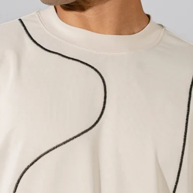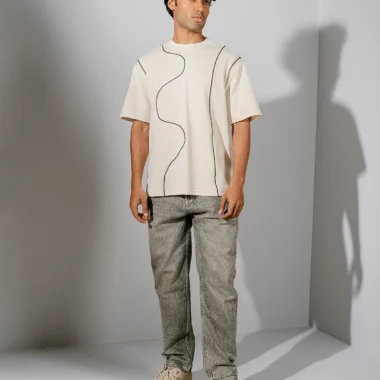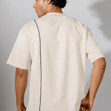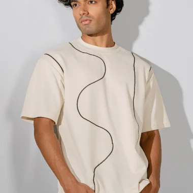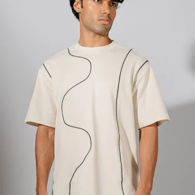 Product Description: T-shirt. Round neck with dropped shoulders, half-length sleeves and contrast stitch design. Crafted from a premium blend of cotton and polyester, the fabric provides a soft and breathable feel against the skin while ensuring durability and shape retention. The high-quality cotton makes it comfortable to wear throughout the day. The polyester component adds resilience, helping the t-shirt maintain its structure even after multiple washes.