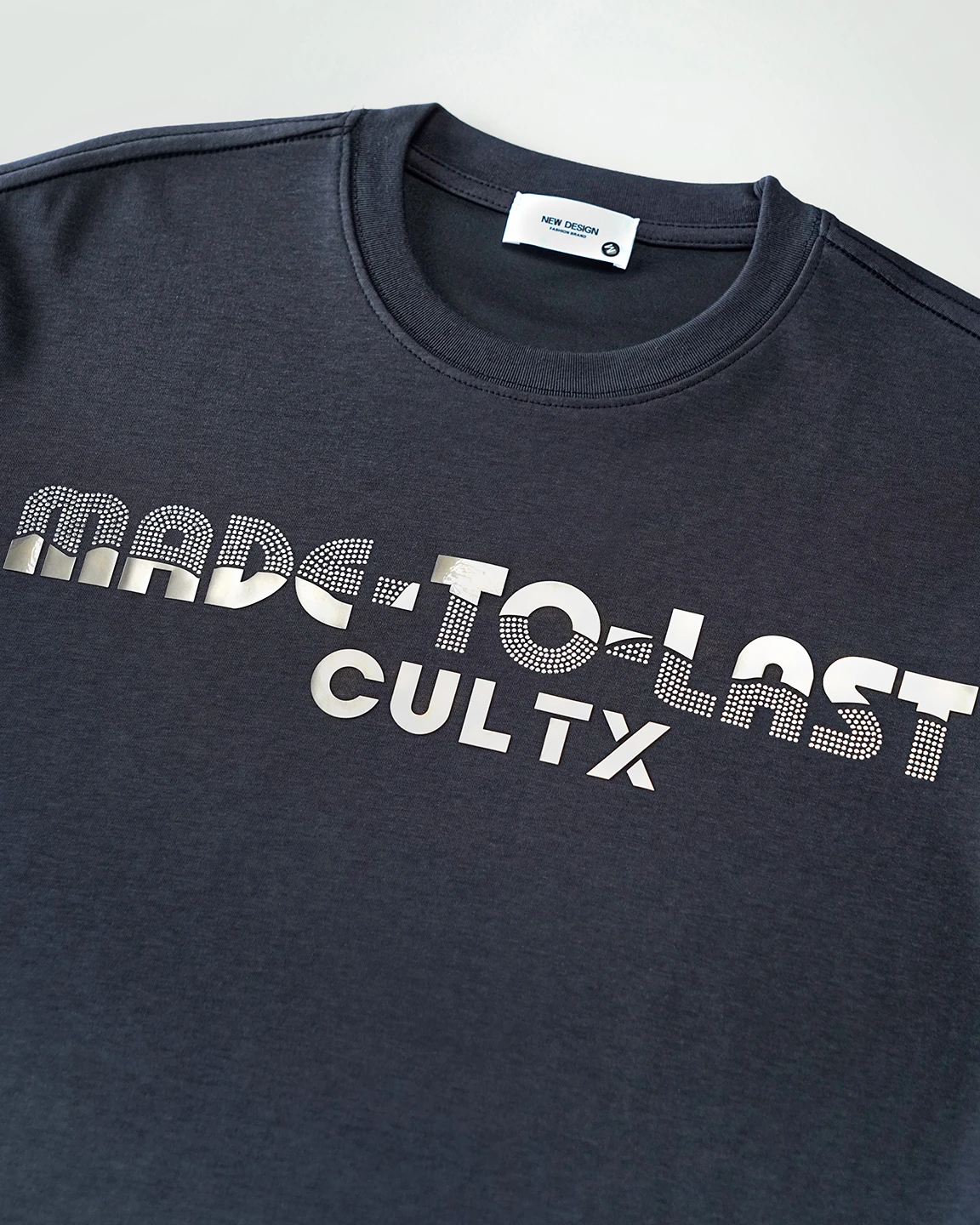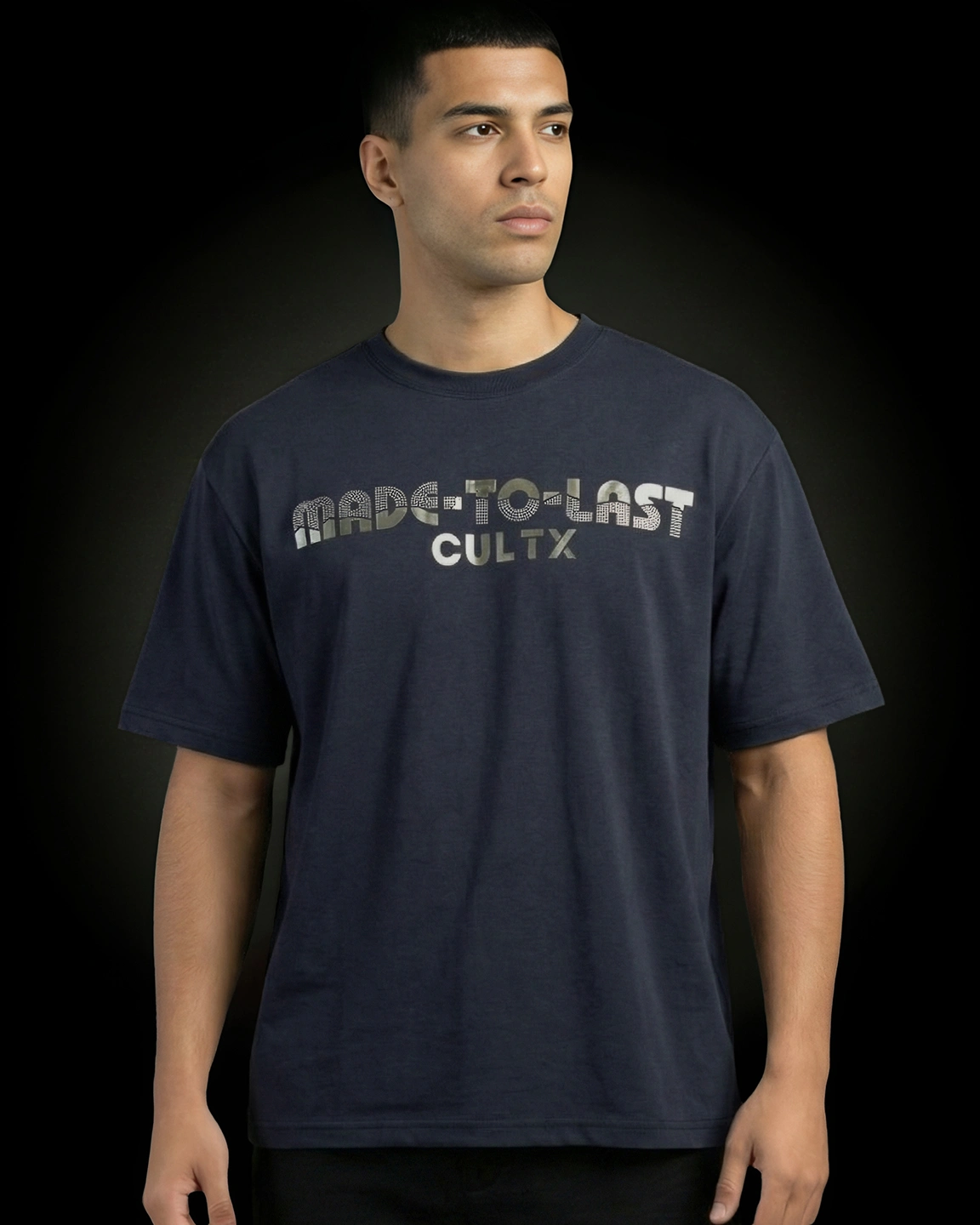 Product Description: T-shirt by Cultx. Round neck with half-length sleeves, featuring rhinestone-style typography detailing on the front. Clean, precise double-needle stitching along the neckline ensures long-lasting strength and a premium look. The inner neck seam is lined with self-binding tape, providing a finished look and enhanced wearer comfort by reducing friction against the skin. Crafted with airtech double-sided fabric.