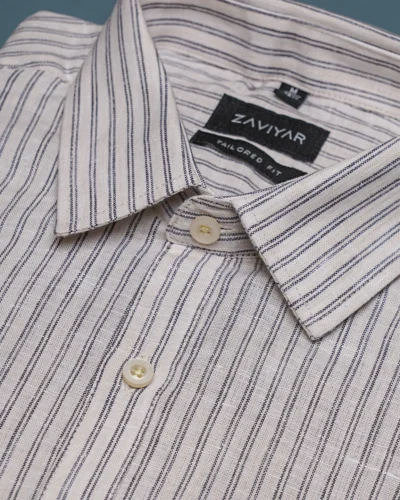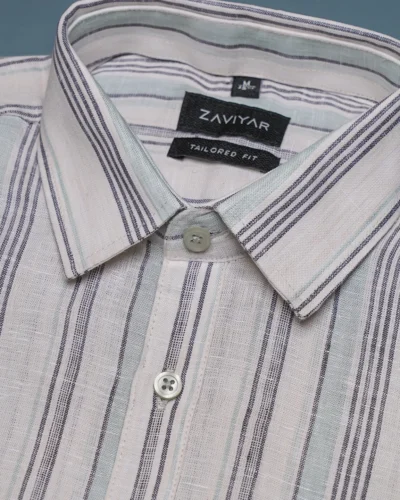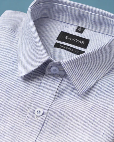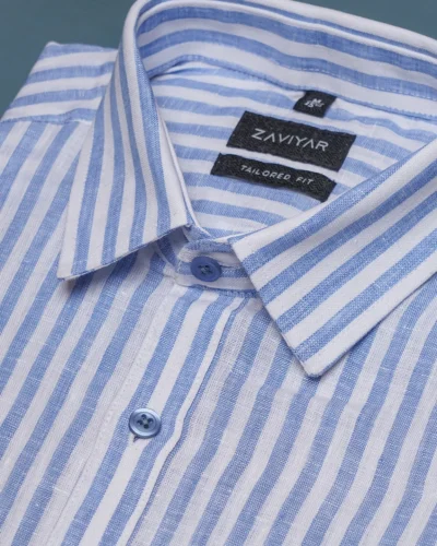 Luxury linen tie collar tailored fit woven striped shirt | Persian Blue