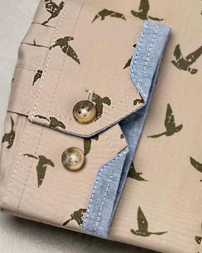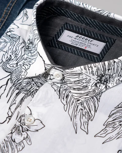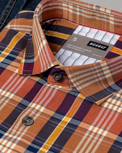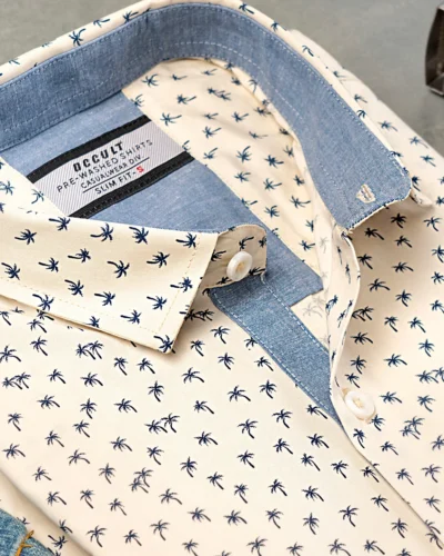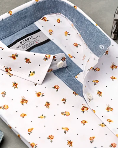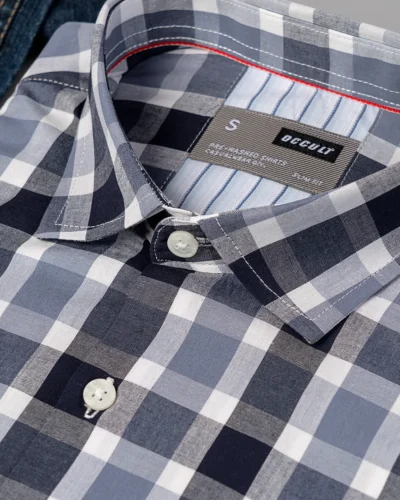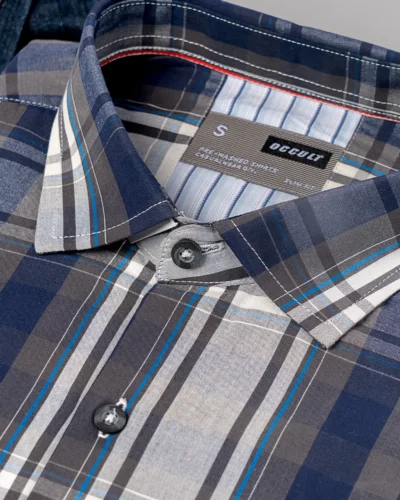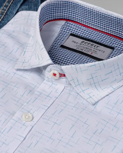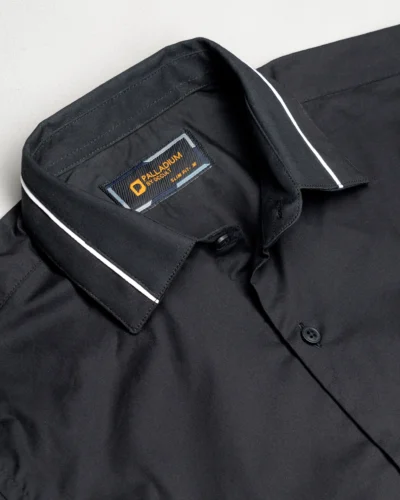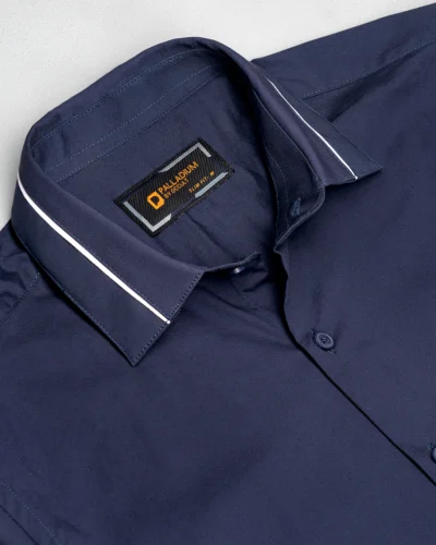 Product Description: Shallow collar, slim fit Shirt. Collar and cuff has contrast piping, long sleeves with gumble, Inner placket twill tape details, back yoke straight and curve hem.