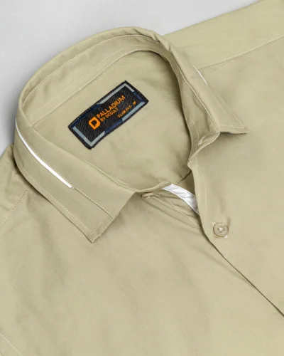Product Description: Shallow collar, slim fit Shirt, long Sleeve with gumble, Inner band has contrast fabric with decorative stitch, back yoke straight, curve hem.