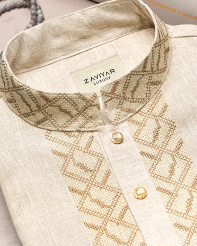 Product Description : Men’s Luxury Linen regular fit Panjabi For Eid. Band Collar. Collar band & sleeve has embroidery details. Decorative metal show button, long Sleeve, straight hem.