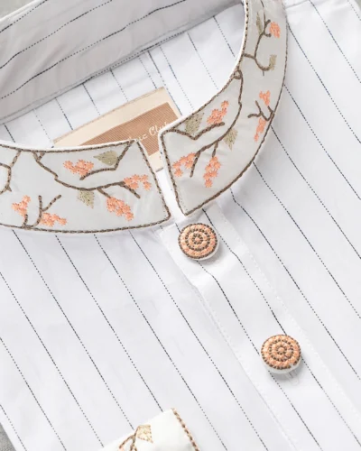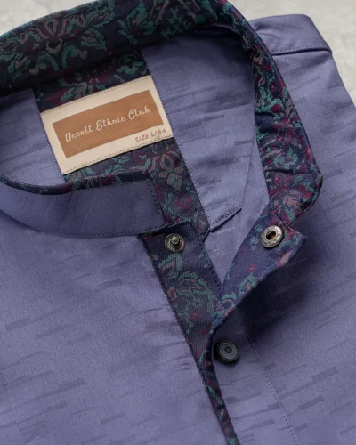 Product Description : Men’s regular fit panjabi with an embroidered band collar and fine piping finish. The front placket is neatly designed and completed with decorative square metal buttons. Matching cuffs feature coordinated embroidery detailing for a clean, premium look.