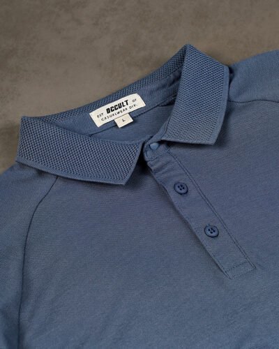Product Description: Knit Polo. Short raglan sleeve rib cuff. Top button DTM snap button and rest are DTM plastic. chest embroidery details, half moon back yoke, straight hem.