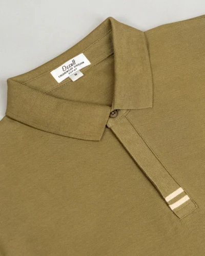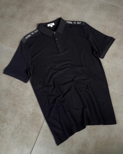 Product Description: Knit Polo. Short sleeve rib cuff, Shoulder line has a decorative twill tape design and button placket on rib. On chest has a patch details, half moon back yoke, straight hem, DTM Button.