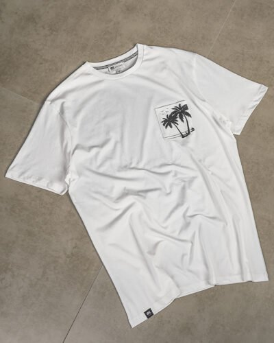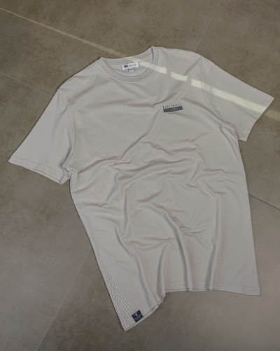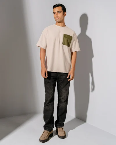 Product description : Drop shoulder T-shirt in round neck and rib details with back print design. Short sleeve with bottom patch details. Straight hem.