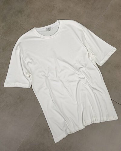 Product Description: Simple crewneck T-shirt with a refined striped design. Crew neck with dropped shoulders and half-length sleeves. Crafted from a premium blend of cotton and polyester, the fabric provides a soft and breathable feel against the skin while ensuring durability and shape retention. The high-quality cotton makes it comfortable to wear throughout the day. The polyester component adds resilience, helping the t-shirt maintain its structure even after multiple washes.