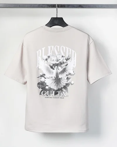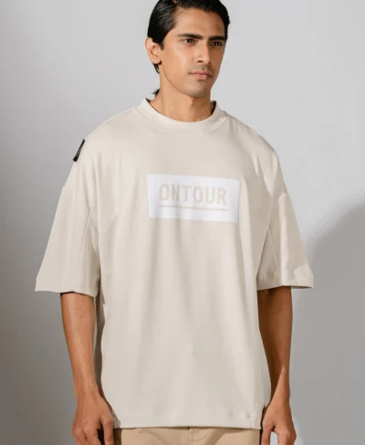 Product Description: T-shirt. Round neck with dropped shoulders, half-length sleeves and high density print at the upper back. Crafted from a premium blend of cotton and polyester, the fabric provides a soft and breathable feel against the skin while ensuring durability and shape retention. The high-quality cotton makes it comfortable to wear throughout the day. The polyester component adds resilience, helping the t-shirt maintain its structure even after multiple washes.