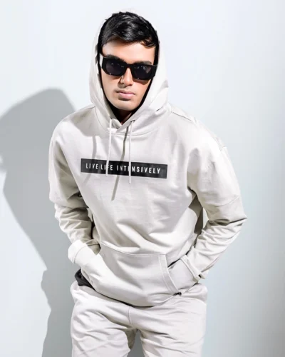 Product Description: Drop Shoulder knit hoodie. Crafted from a soft, high-quality 300 GSM terry fabric that feels comfortable on the skin, making it ideal for all-day wear. Sleeve cut & sew with mid-chest print design and full sleeve with rib hem details.