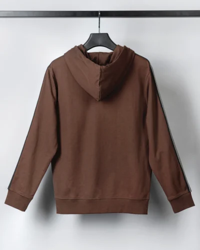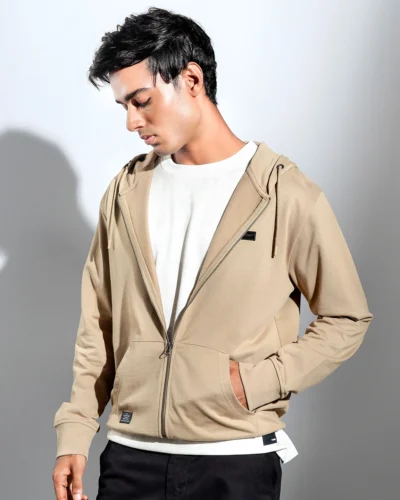 Product Description: Regular fit full zipper knit hoodie. Crafted from a soft, high-quality 300 GSM terry fabric that feels comfortable on the skin, making it ideal for all-day wear. hood outside tricot tape detail, patch logo in chest, woven patch on top kangaroo pocket, full sleeve with rib hem.