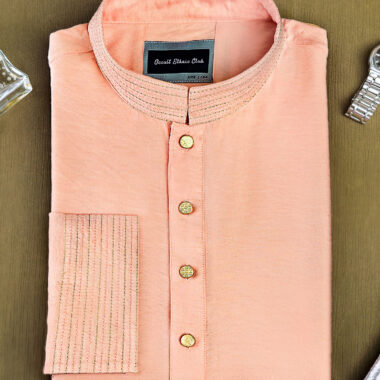 Men’s regular fit Panjabi in viscose fabric with band collar  & sleeve cuff piping details. Decorative stitch &  metal snap button, long Sleeve, straight hem.