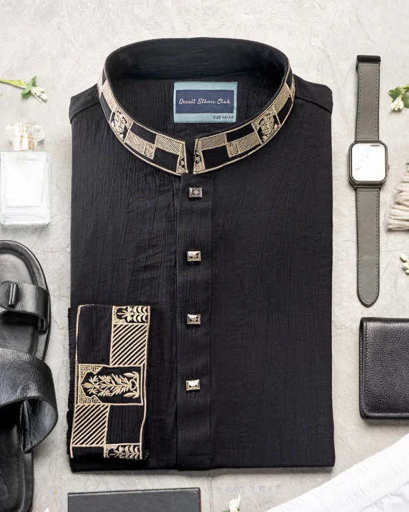 Product Description : Men’s Creepe Cotton regular fit panjabi For Eid. Band Collar. Collar band & sleeve cuff has embroidery details. Decorative metal show button, long Sleeve, straight hem.