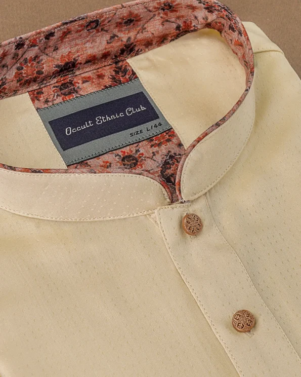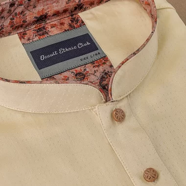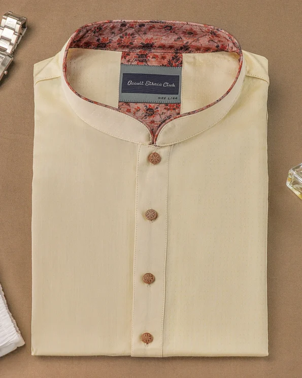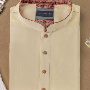 Men’s fancy cotton slim fit panjabi. Band Collar with contrast piping. Button placket with contrast fabric piping & show button. Moon has cut & sew contrast design. Long Sleeve with contrast piping, straight hem.