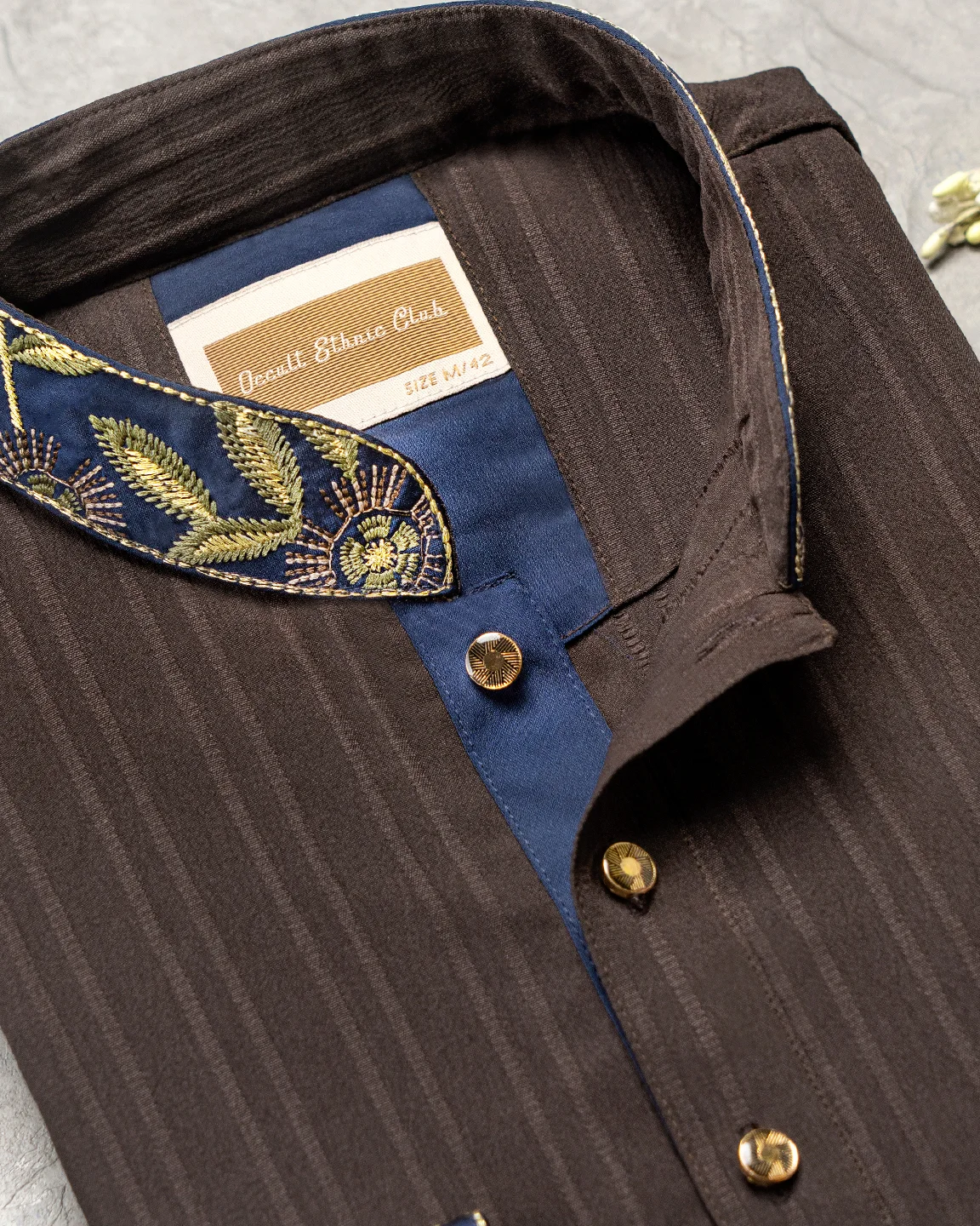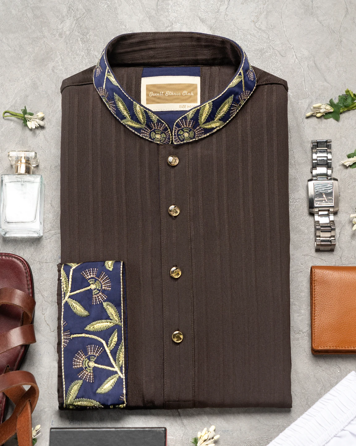 Product Description : Men’s slim fit panjabi with embroidered band collar. Decorative metal buttons on the front placket. Matching cuffs with embroidery detailing. Crafted with lyocell fabric.