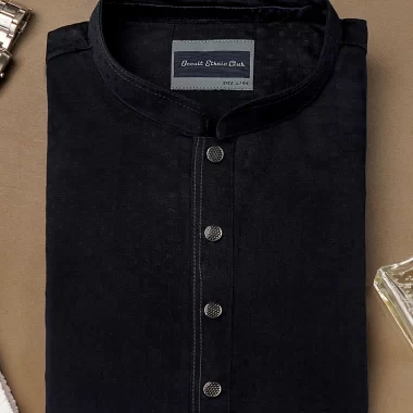 Men’s fancy cotton slim fit panjabi. Manderin Collar with decorative stitch. Button placket with decorative stitch & show button . Inside button Plackets has twill tape details . Moon has cut & sew design. Long Sleeve, straight hem.