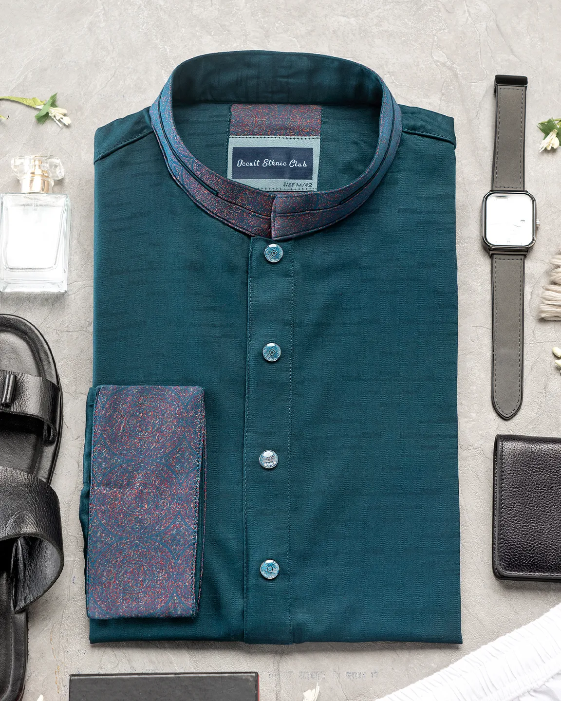 Product Description : Men’s Fancy Cotton regular fit panjabi For Eid. Band Collar. Collar band, Body & sleeve has contrast fabric details. Decorative metal show button, long Sleeve, straight hem.