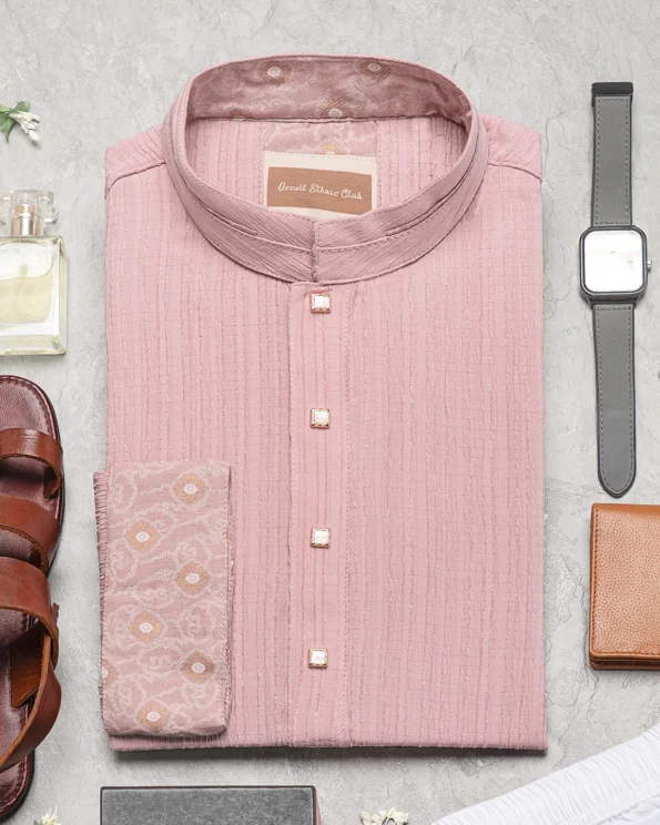 Product Description: Men’s Crepe regular fit panjabi For Eid. Band Collar. Collar band, Placket & sleeve cuff has contrast details. Decorative metal show button, long Sleeve, straight hem.