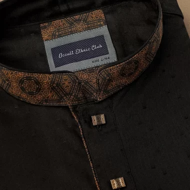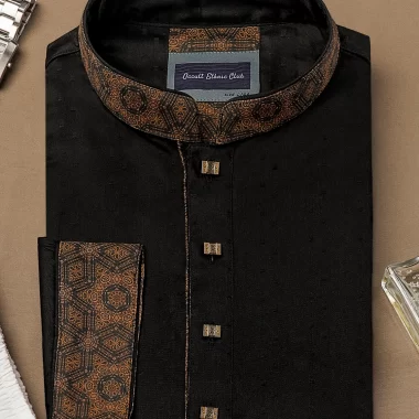 Men’s Fancy Cotton slim fit panjabi. Band collar. Collar band with contrast details, Contrast inner placket piping. Moon has cut & sew contrast design. sleeve hem with contrast on folding cuff. Back yoke with contrast loop, Long Sleeve, straight hem.