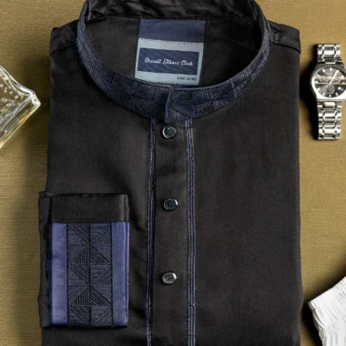 Men’s regular fit Panjabi in viscose fabric with band collar  & sleeve cuff piping details. Decorative stitch &  metal snap button, long Sleeve, straight hem.