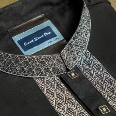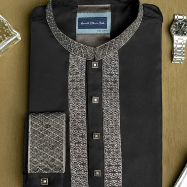 Men’s regular fit Panjabi in Premium Cotton fabric with band collar  & sleeve cuff piping details. Decorative stitch &  metal snap button, long Sleeve, straight hem.