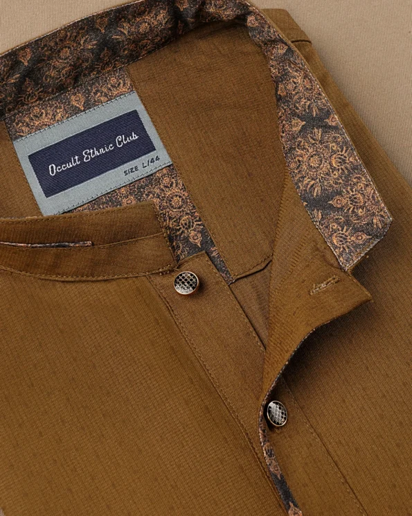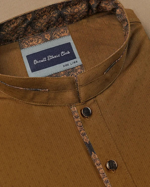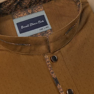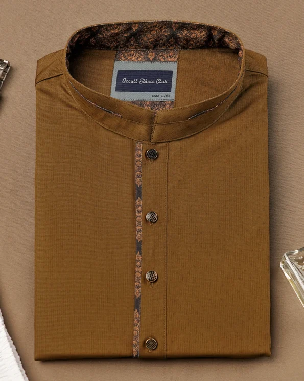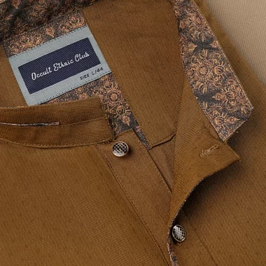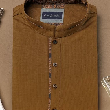 Men’s fancy cotton slim fit panjabi. Band Collar with contrast piping. Button placket with contrast fabric & show button. Moon has cut & sew contrast design. Long Sleeve with contrast piping, straight hem.