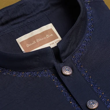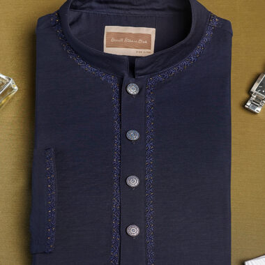Men’s regular fit Panjabi in viscose fabric with band collar  & sleeve cuff piping details. Decorative stitch &  metal snap button, long Sleeve, straight hem.